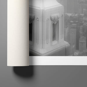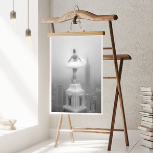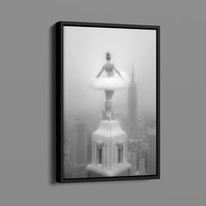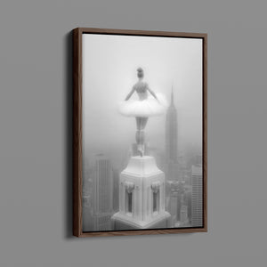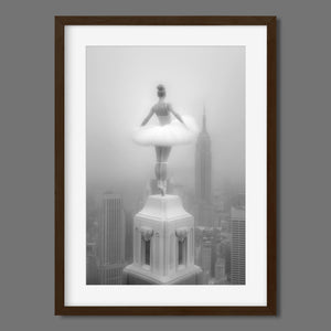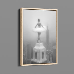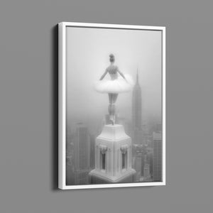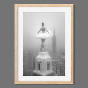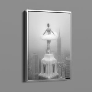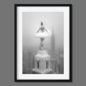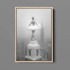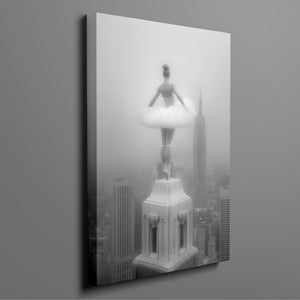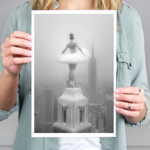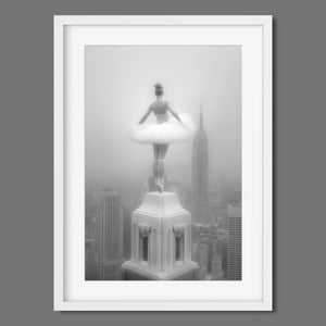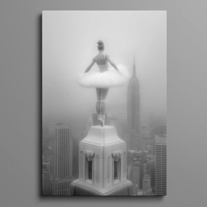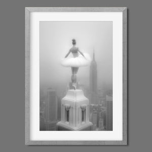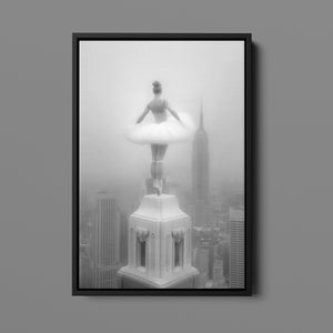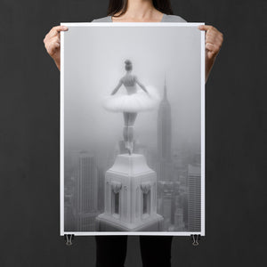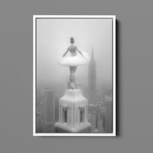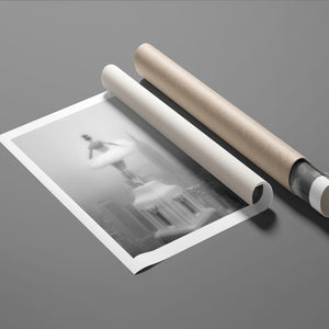 Majestic Reverie from the Vertige - En Pointe collection by Ali Solene elevates ballet to the pinaccle of architectural poetry. This arresting black-and-white fine art photograph captures a ballerina in an awe-inspiring pointed pose atop a Manhattan skyscraper, her tulle tutu like a blossom against the iconic New York skyline. With vintage-inspired sophistication, the composition marries exaggerated perspectives, ant ethereal lighting that sculpts the dancer's form, creating a visual dialogue between human fragility and urban might. Part of a series exploring the vertigo of beauty and balance, this piece freezes a moment where gravity and grace collide in perfect tension.