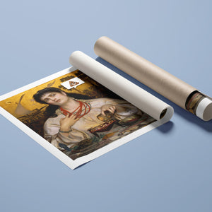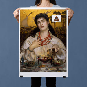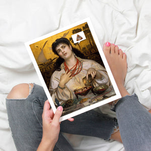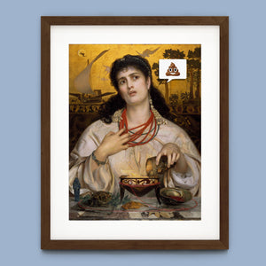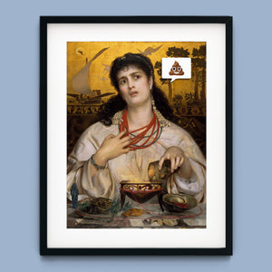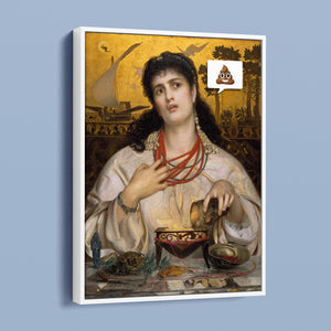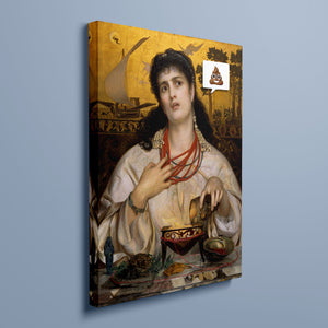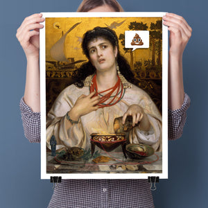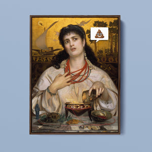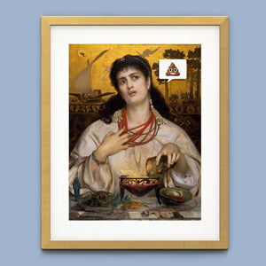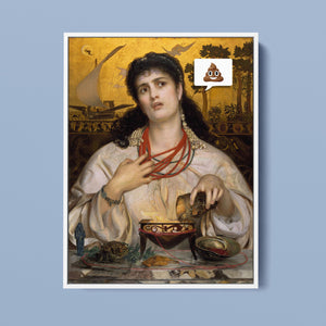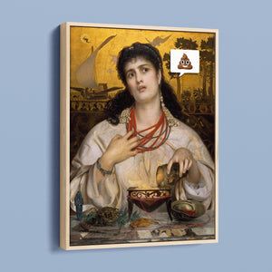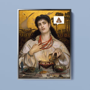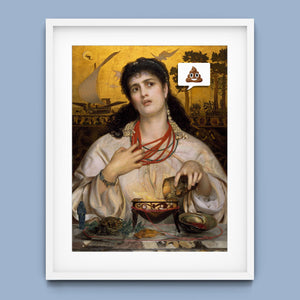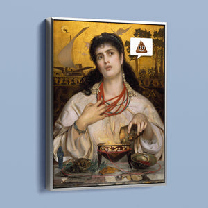 Medea - RGRTS is a unique altered portrait that merges historical sophistication with a playful twist. The 3x4 canvas features a contemplative woman in an ornate white dress, accented by a golden headdress and rich textures. Maritime elements like a turtle and seashell, combined with meme-inspired details, add a humorous and whimsical touch to the classic portrait. The expressive jewelry and intricate design create a striking contrast with the modern elements, making this artwork a memorable piece that bridges the gap between traditional art and contemporary culture.