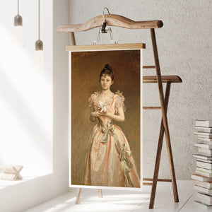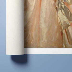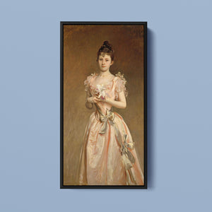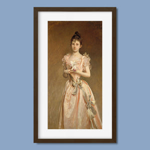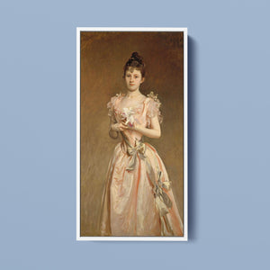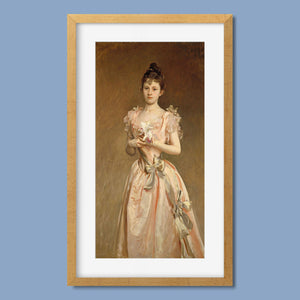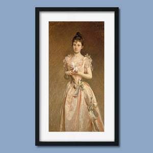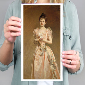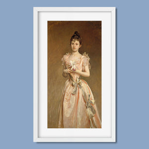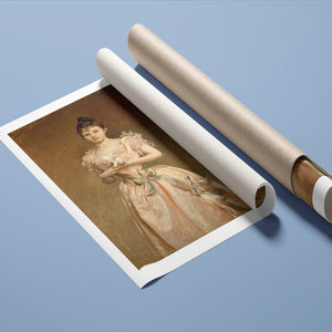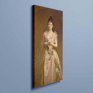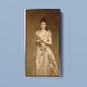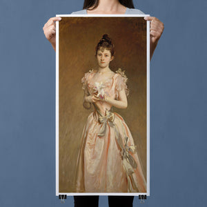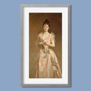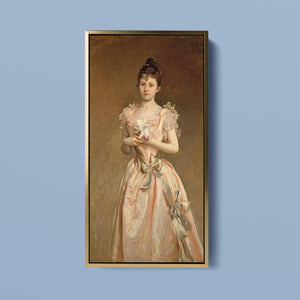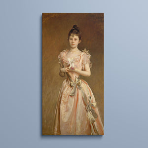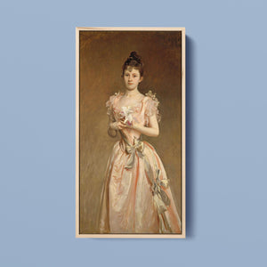 Miss Grace Woodhouse by John Singer Sargent presents an elegant portrait of a young woman in a vintage gown adorned with bows. The soft pastel colors and serene expression reflect the refined beauty and poise of the debutante, encapsulating the essence of Victorian fashion and grace.