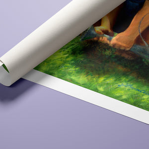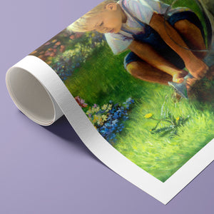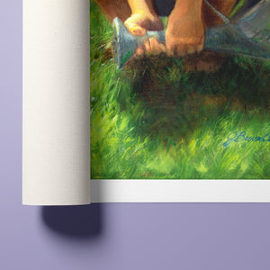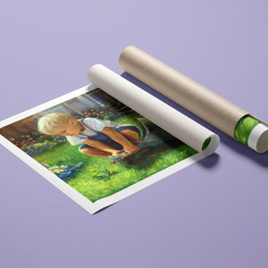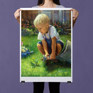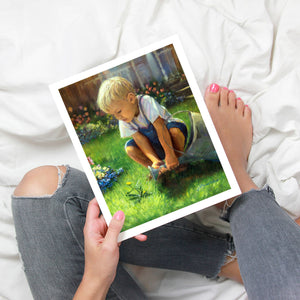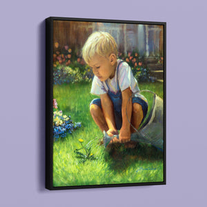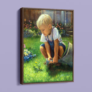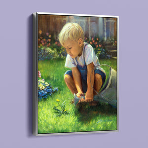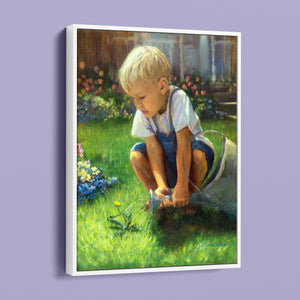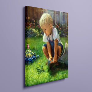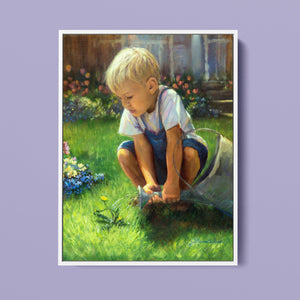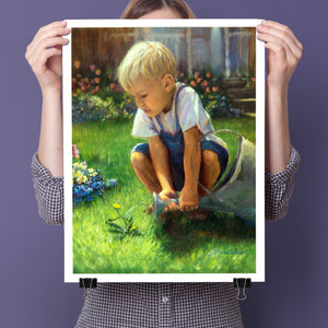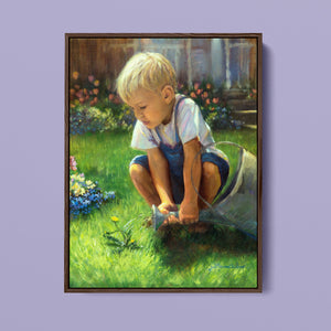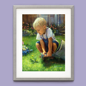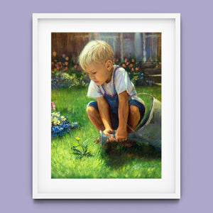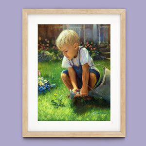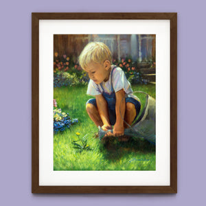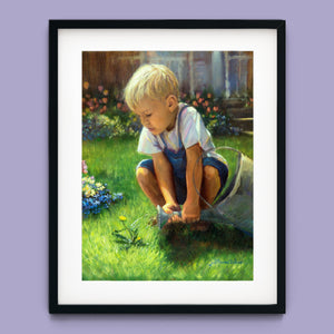 Experience the joy and innocence of childhood with Mommy's Favorite Flower, a serene artwork featuring a child lovingly tending to a garden. The painting showcases a young gardener in overalls, kneeling by a vibrant flower, surrounded by lush greenery and sunlight. Rendered in rich greens, browns, and navy, this piece beautifully captures the nurturing spirit and playful curiosity of a summer day.