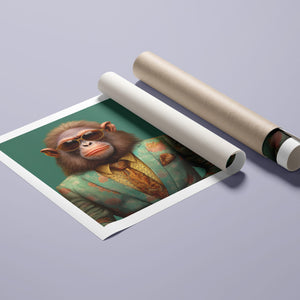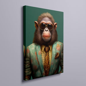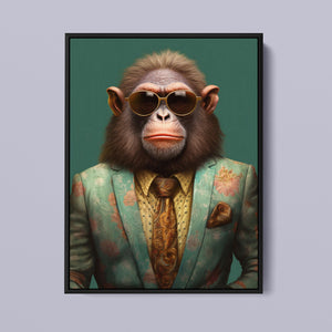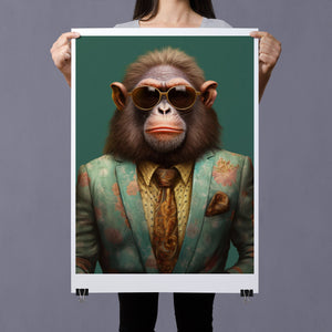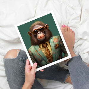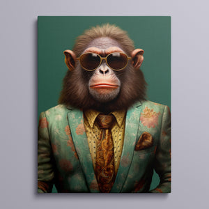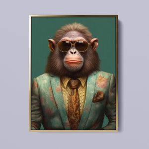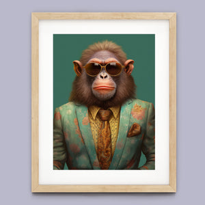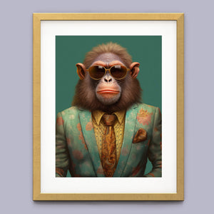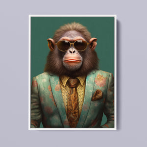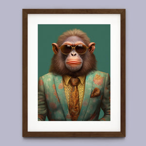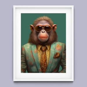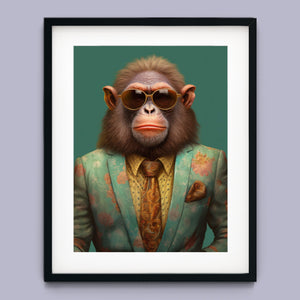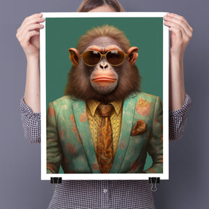 Monkey Business - Bart presents a fashionable chimp dressed in a sharp suit and sunglasses, exuding a playful yet professional demeanor. Set against a green background, this anthropomorphic portrait combines humor with elegance. The chimp’s trendy attire and expressive personality highlight a whimsical and satirical take on business fashion.