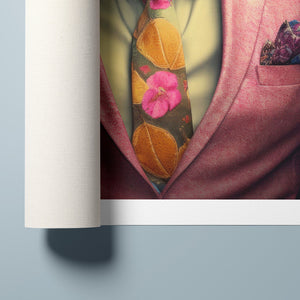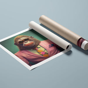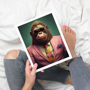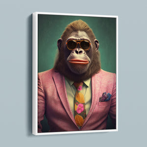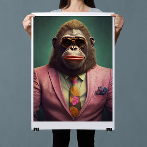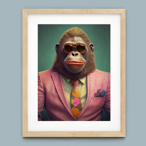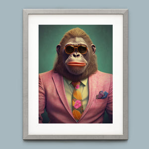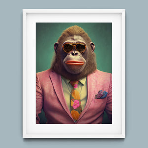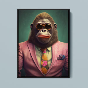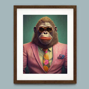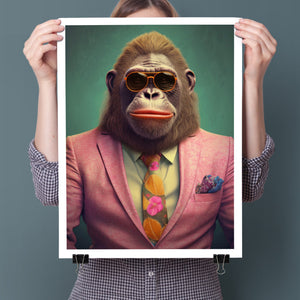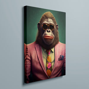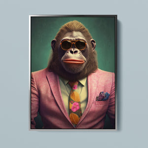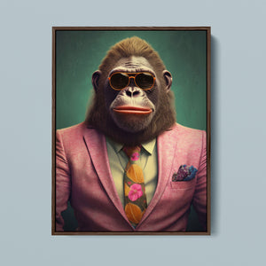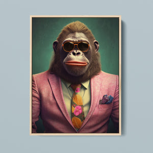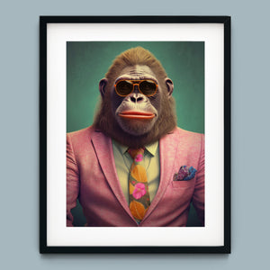 Monkey Business - Gus presents a playful gorilla dressed in a stylish suit and tie, complete with sunglasses. The portrait blends whimsical humor with sophistication, set against a vintage backdrop in vibrant colors. The gorilla’s quirky and imaginative appearance adds a fun twist to the classic business attire, making it a charming and creative piece of art.