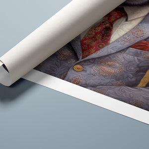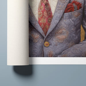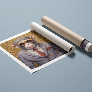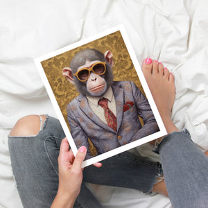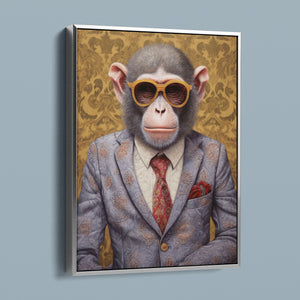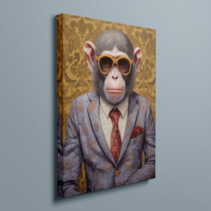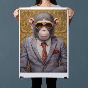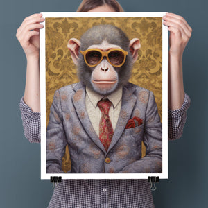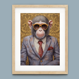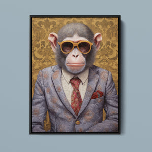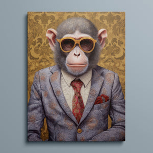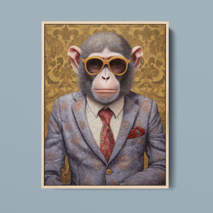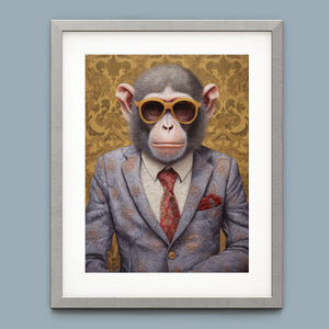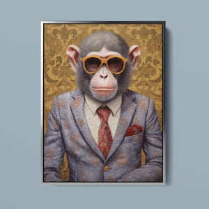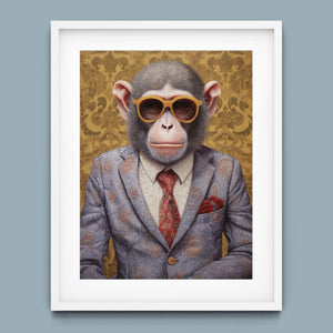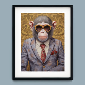 Monkey Business - Sam features a stylized chimpanzee dressed in a formal suit and tie, complete with sunglasses. The portrait combines elegance with a playful twist, capturing the chimp’s humorous and sophisticated side. Set against a detailed and artistic background, this piece blends business attire with creative whimsy for a unique and fun portrayal.