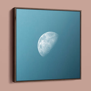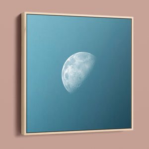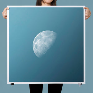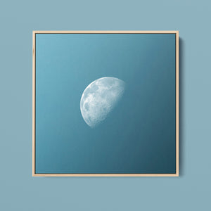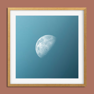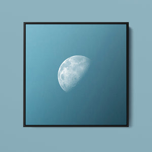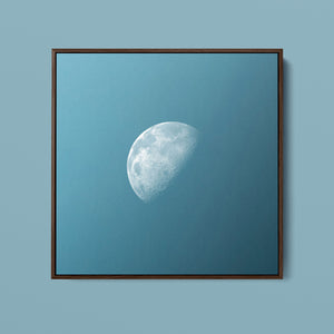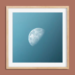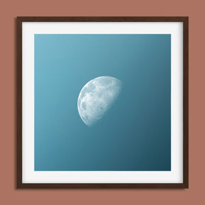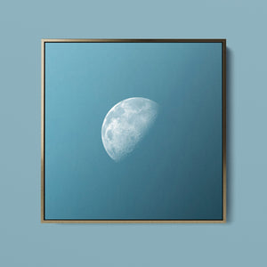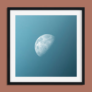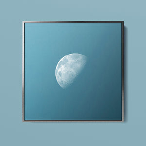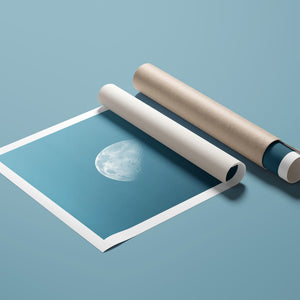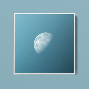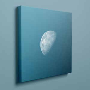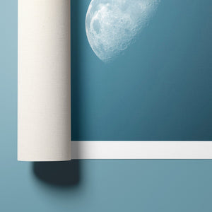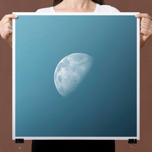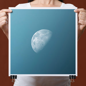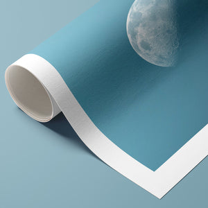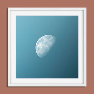 "Moon Dust" offers a serene and surreal view of the lunar surface, captured in a striking blue and white palette. The photograph highlights the cratered surface of the moon during its waxing gibbous phase, set against a teal background that enhances the ethereal quality of the celestial scene. This piece evokes the tranquility of the night sky and the cosmic beauty of space, making it a perfect addition for those fascinated by astronomy and the universe.