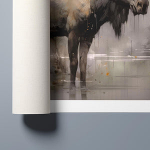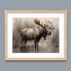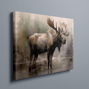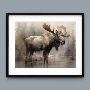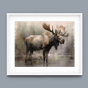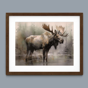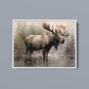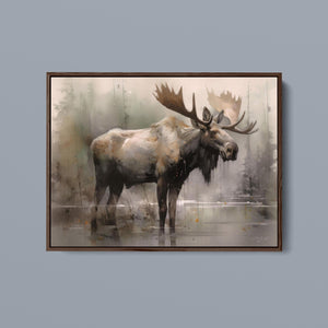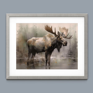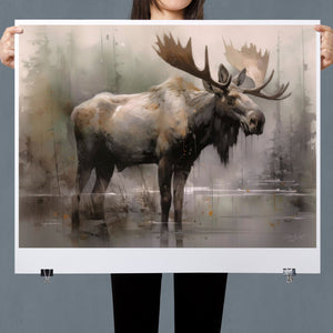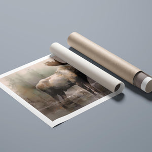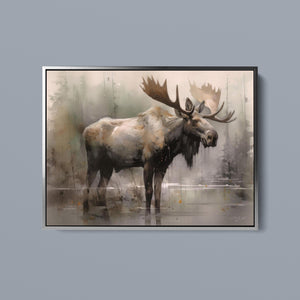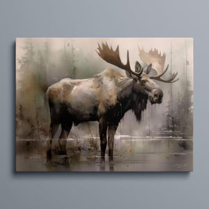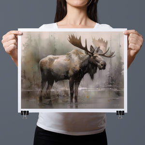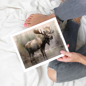 "Moose in the Dusk" beautifully portrays a bull moose in a serene autumn setting. This modern watercolor painting employs subtle pastel tones to highlight the moose’s majestic presence amidst the foggy, Rocky Mountain landscape, reflecting the quiet elegance of nature.