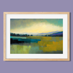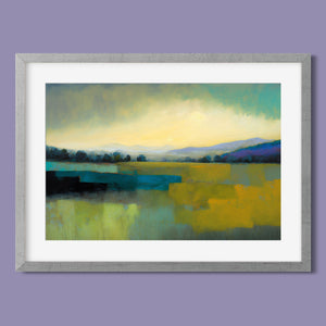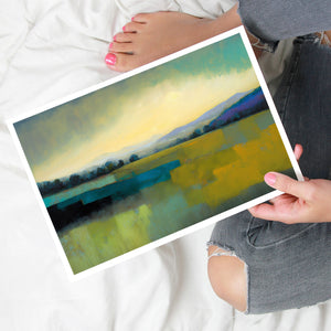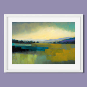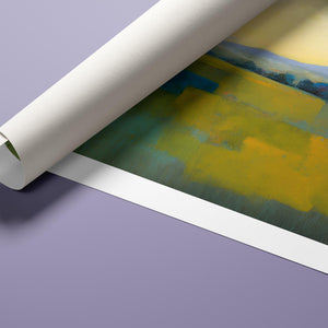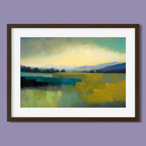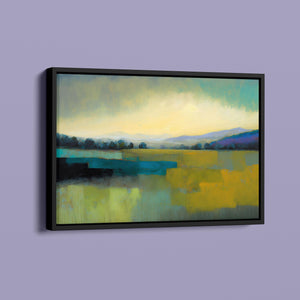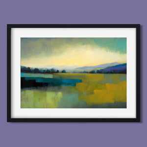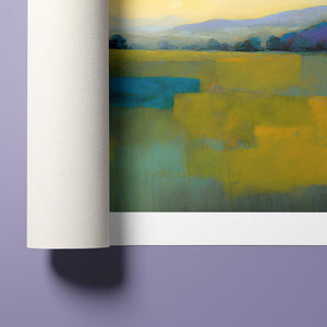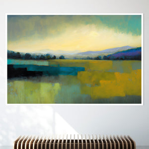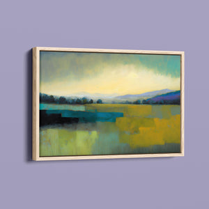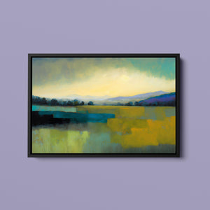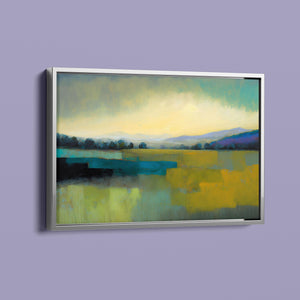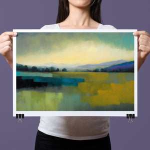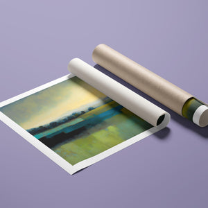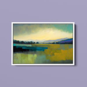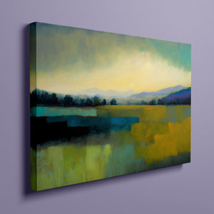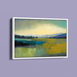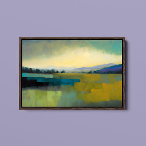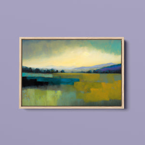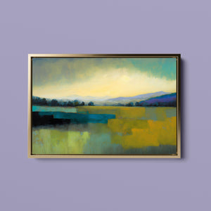 Experience the tranquil beauty of dawn with Morning Sunrise I, a serene abstract landscape painting that captures the peaceful golden hour. Gentle hues of blue, green, navy, and gold melt together as the first light of morning reflects off still waters and silhouettes distant hills. This impressionist artwork evokes a calm and peaceful awakening in nature, with soft amber light illuminating the rural vista.