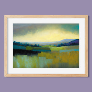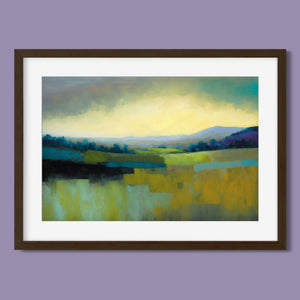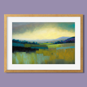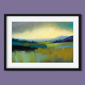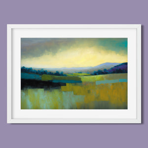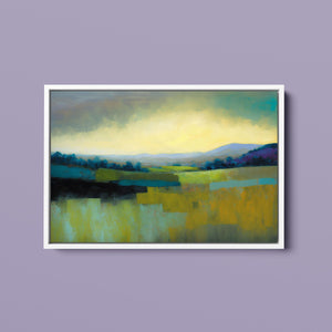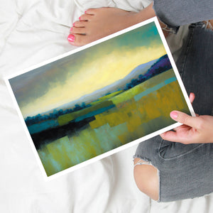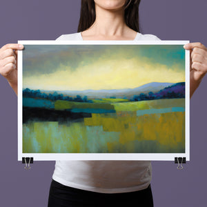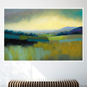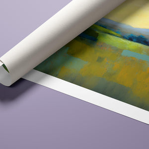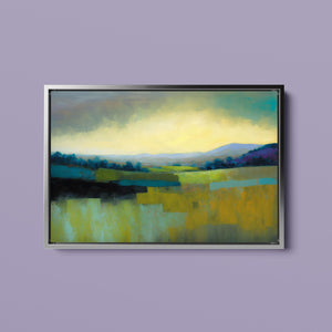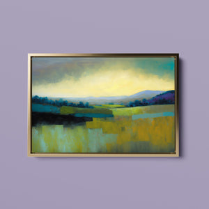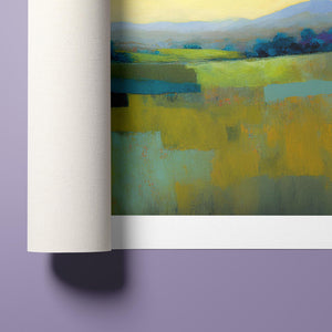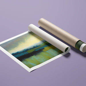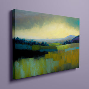 Experience the tranquil beauty of dawn with Morning Sunrise II, a serene abstract landscape painting that captures the morning hour. Gentle hues of blue, green, navy, and gold melt together as the first light of morning reflects off still waters and silhouettes distant hills. This impressionist artwork evokes a calm and peaceful awakening in nature, with soft amber light illuminating the rural vista.