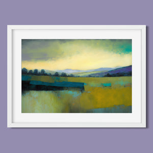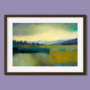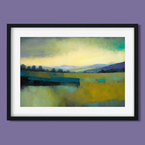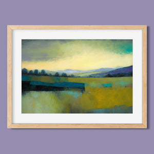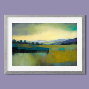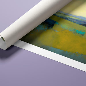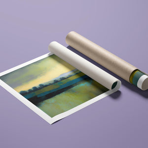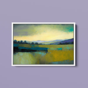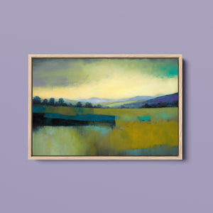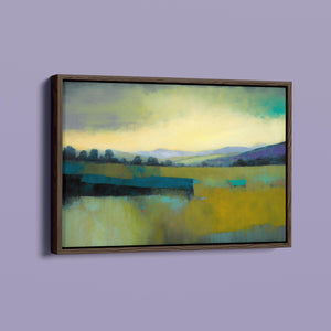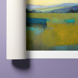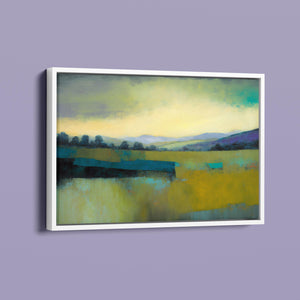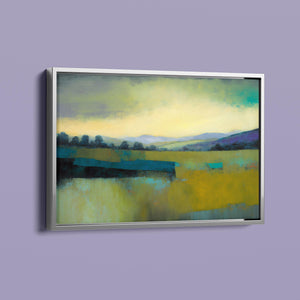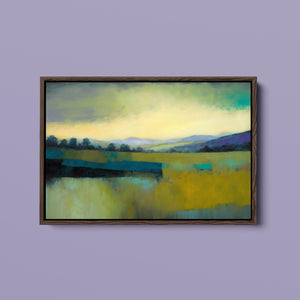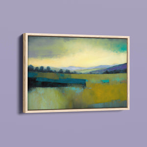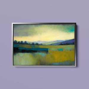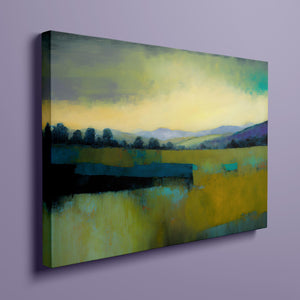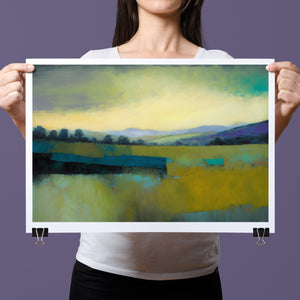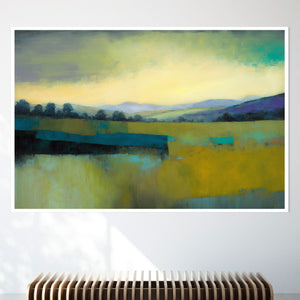 "Morning Sunrise V" is a tranquil abstract landscape painting showcasing the serene beauty of dawn. The soft morning light gently illuminates rolling hills and open fields, with a palette of warm yellows, greens, and blues. This impressionistic artwork evokes a peaceful, pastoral scene, inviting a sense of calm and harmony. Ideal for adding a touch of nature's quiet elegance to your living space.