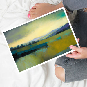 Abstract landscape painting of a peaceful sunrise over rolling hills and open fields with warm yellows, greens, and blues, evoking tranquility and nature’s calm.