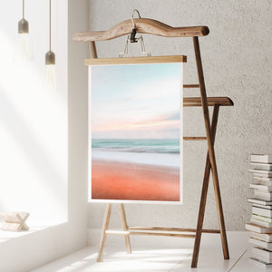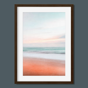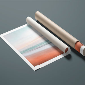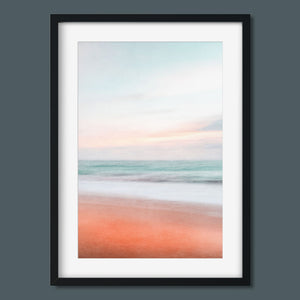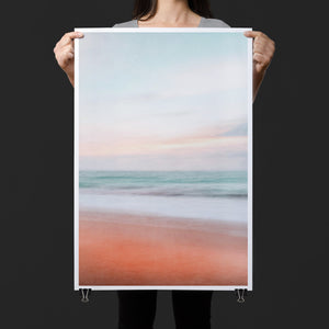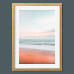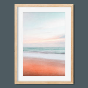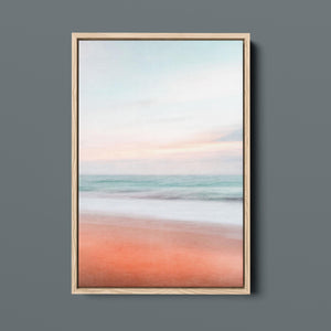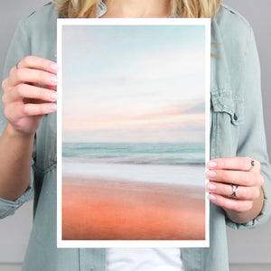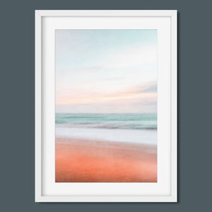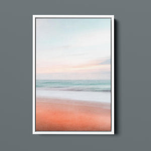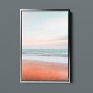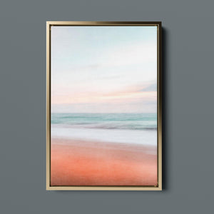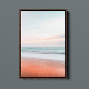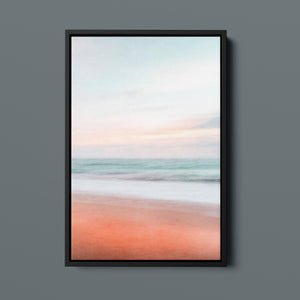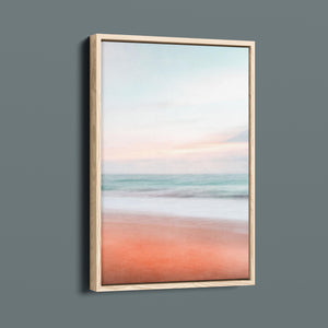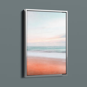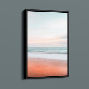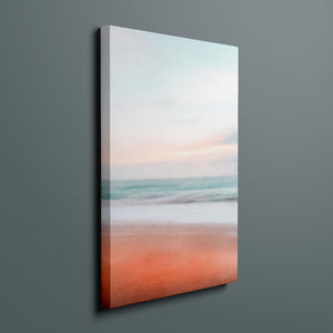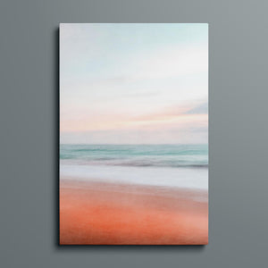Feel the gentle rhythm of the sea with "Motion of the Ocean," a captivating abstract landscape that evokes the tranquility of dusk over a calm shoreline. Soft pastel tones of blue, pink, orange, and white blend seamlessly, creating a serene seascape filled with peaceful reflections and blurred motion. The gentle hues and flowing textures capture the soothing ambiance of a quiet evening by the ocean, inviting you to immerse yourself in its peaceful, calming embrace.