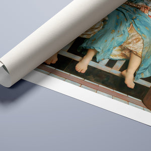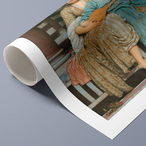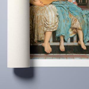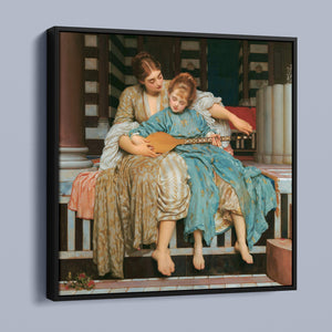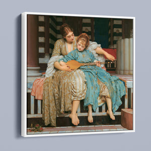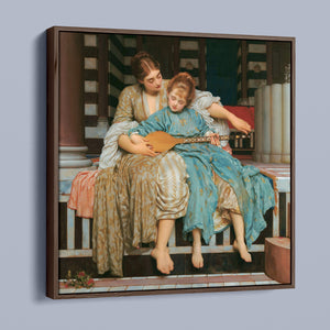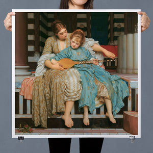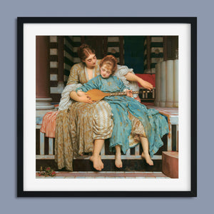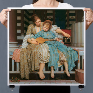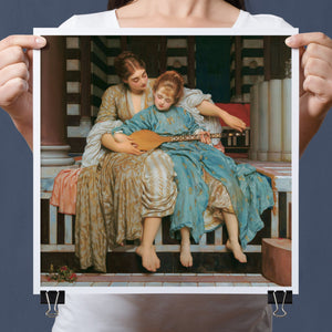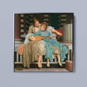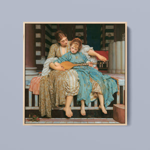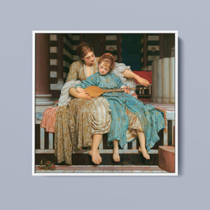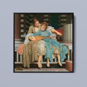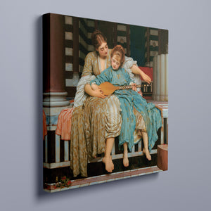 "Music Lesson" by Frederic Lord Leighton presents a refined Victorian scene where a tutor imparts musical knowledge to a young pupil. The painting features detailed drapery and classical architecture, reflecting elegance and serenity. The use of pastel colors and intricate details underscores the intimate and educational atmosphere of the music lesson, showcasing Leighton's mastery in capturing classical beauty and harmony.