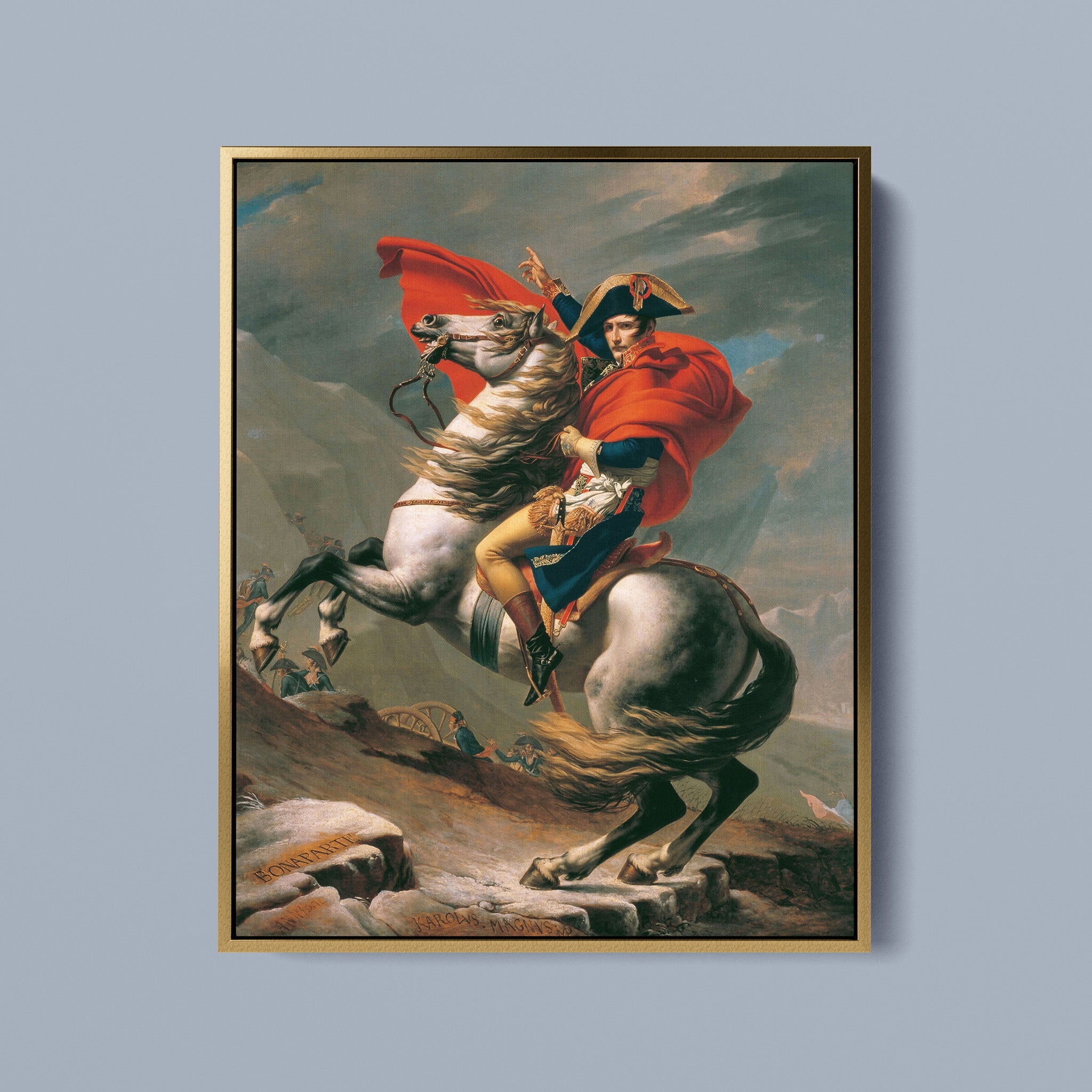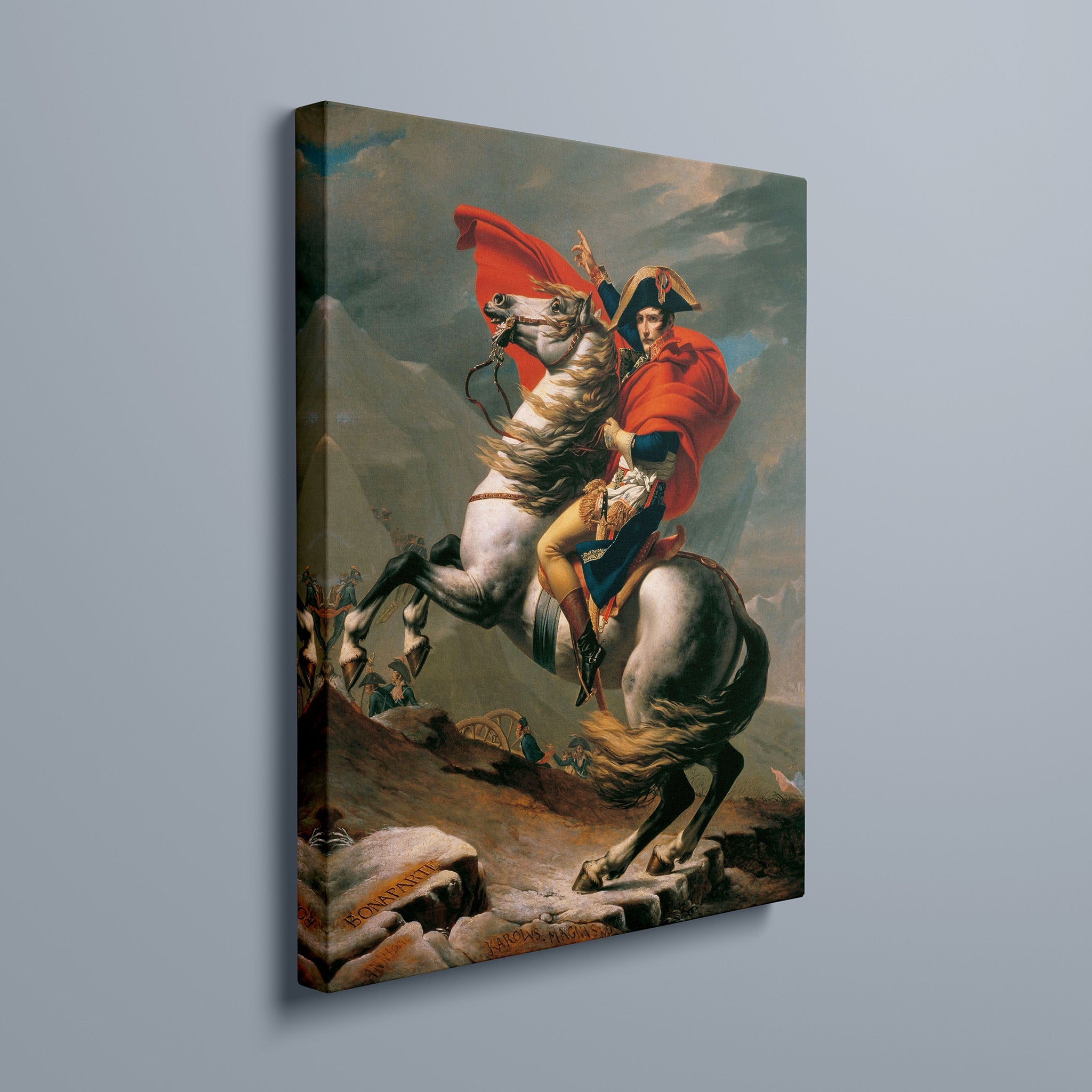 "Napoleon at the Great St. Bernard" by Jacques-Louis David is a powerful 19th-century painting that vividly depicts Napoleon Bonaparte's legendary crossing of the Alps. The artwork captures the dramatic and heroic moment with striking detail, emphasizing Napoleon’s commanding presence and the harsh conditions of the mountainous terrain. David’s neoclassical style is evident in the meticulous attention to historical accuracy, dramatic composition, and grand portrayal of Napoleon’s leadership. The painting not only celebrates Napoleon's military prowess but also reflects David’s mastery in conveying both the epic scale of historical events and the psychological depth of his subjects. This iconic work stands as a testament to the grandeur and resolve associated with Napoleon’s legacy.