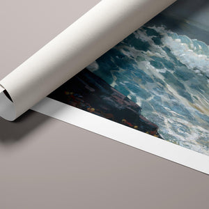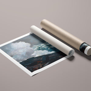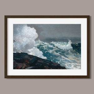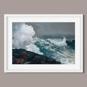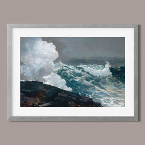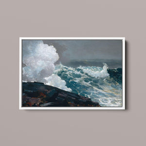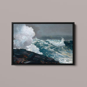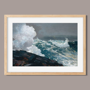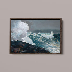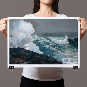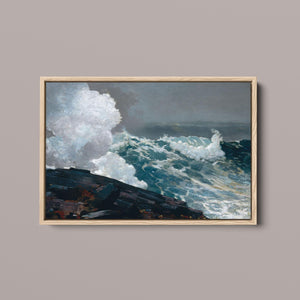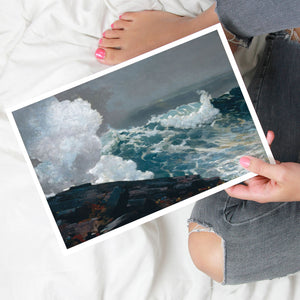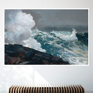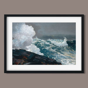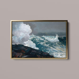 "Northeaster" by Winslow Homer captures the raw power and dramatic intensity of a stormy seascape. This horizontal painting vividly portrays the tumultuous ocean with cresting waves, foamy surf, and a rugged, rocky coastline. The use of white, blue, navy, and gray tones enhances the storm’s fierce energy and overcast atmosphere, reflecting the dynamic and turbulent nature of the maritime scene. Homer’s realistic depiction of the tempestuous waves and dramatic sky underscores the power of nature in its most elemental form.