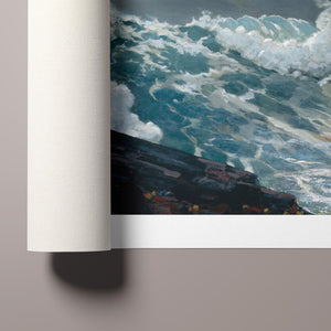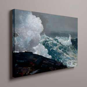 Stormy seascape by Winslow Homer featuring cresting waves, rocky coastline, and a tempestuous sky in shades of white, blue, and gray, capturing the dynamic power and intensity of a Northeaster with realistic and dramatic detail.
