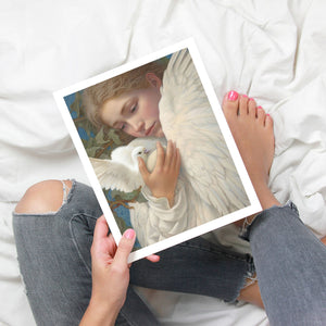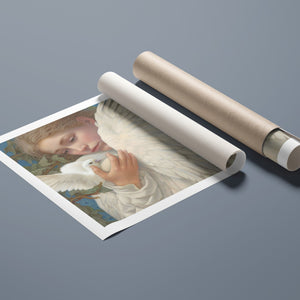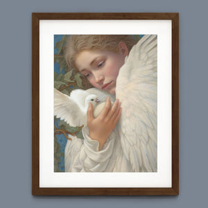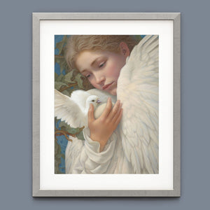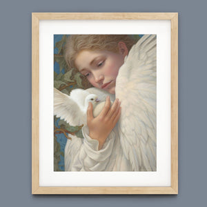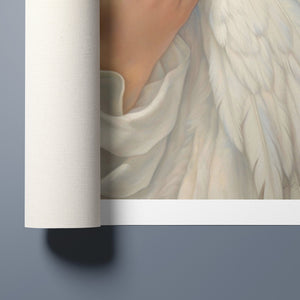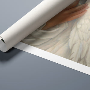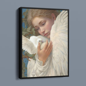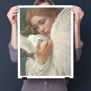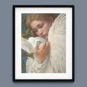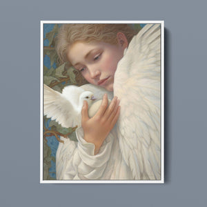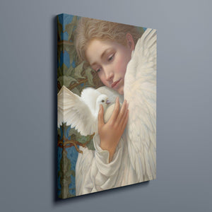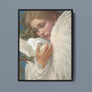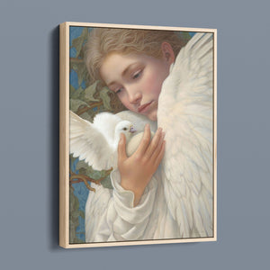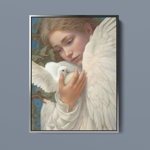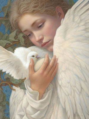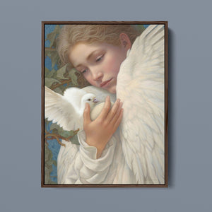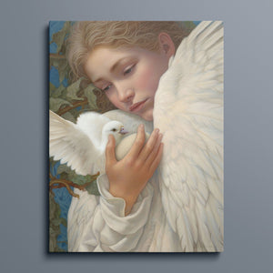 Nurturing Wings - Whispers of Compassion is a touching portrayal of angelic care and affection. The 3x4 vertical canvas features an angelic figure enveloping a dove, symbolizing peace and nurturing protection. The artwork combines soft blue, rose gold, and white tones to create a serene and comforting atmosphere. With delicate white feathers and a gentle embrace, this piece radiates warmth and tenderness, capturing the essence of maternal love and tranquility. Ideal for creating a peaceful and inspirational space, Nurturing Wings offers a soothing and ethereal presence.