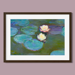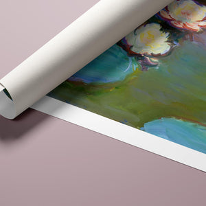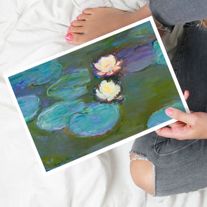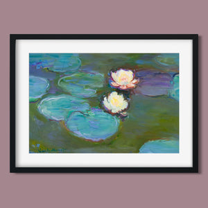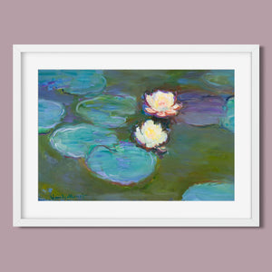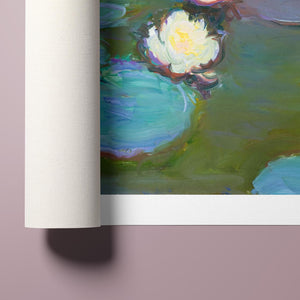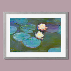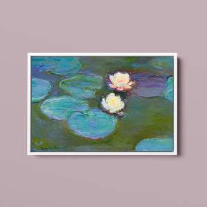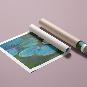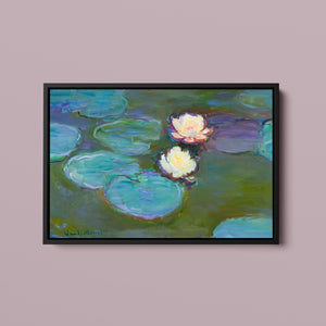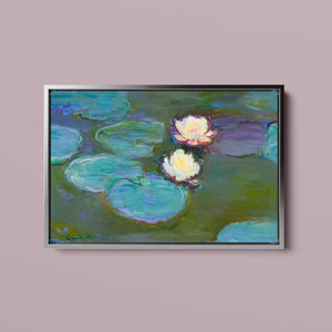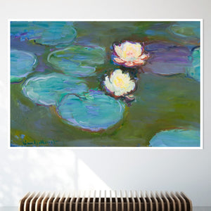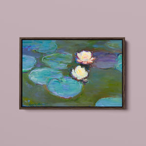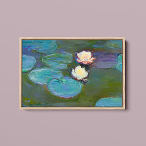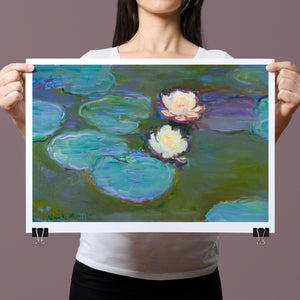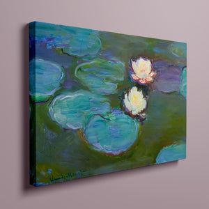 "Nympheas" by Claude Monet captures the enchanting beauty of water lilies in a serene pond setting. This horizontal Impressionist painting is characterized by its lush blues and greens, depicting a tranquil water surface adorned with lily pads and blossoms. Monet’s use of impasto technique and pastel colors creates rich textures and reflections that enhance the painting's sense of depth and tranquility. The artwork evokes the organic forms and serene ambiance of Monet’s Giverny garden, highlighting his mastery of capturing the delicate interplay of light and water in a botanical landscape.
