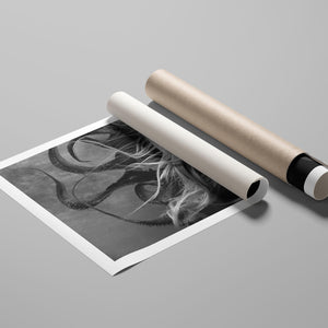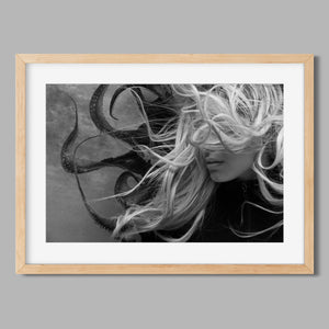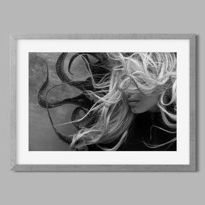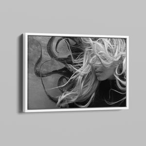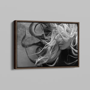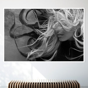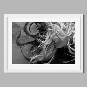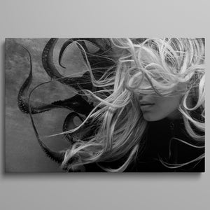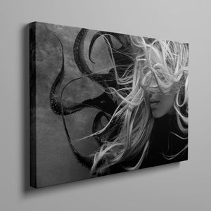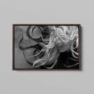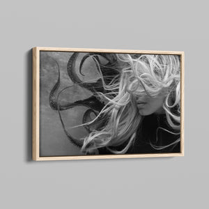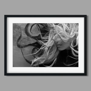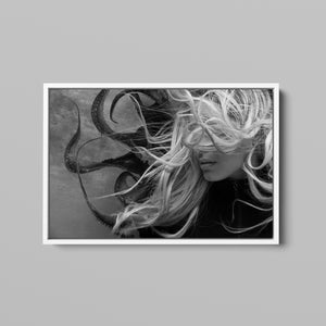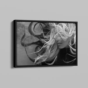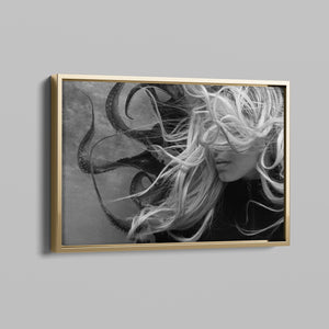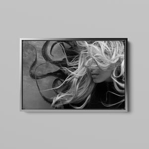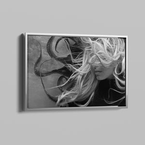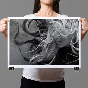 An evocative fusion of nature and imagination, "Octopus Leg and Goldie Locks" merges the elegance of a woman's flowing hair with the surreal form of an octopus leg. This black-and-white fantasy portrait contrasts human softness with the textured complexity of marine life, creating a layered, metaphorical scene. The surreal, abstract composition blurs the lines between woman and cephalopod, offering an intriguing and mysterious visual narrative. Ethereal and dark, the piece invites viewers into a world where creativity, nature, and elegance intertwine in unexpected ways.