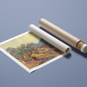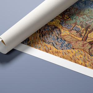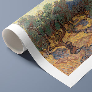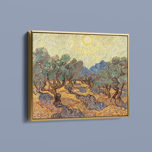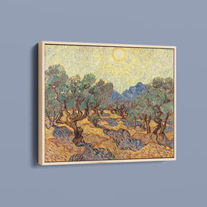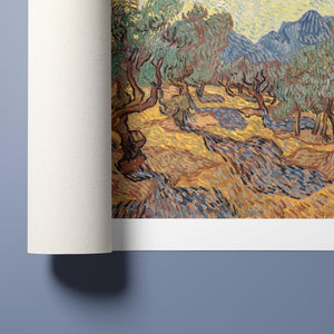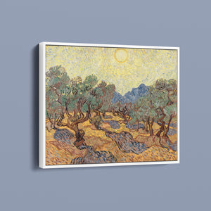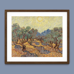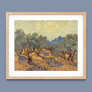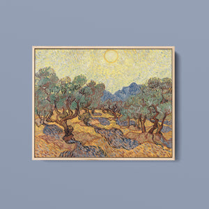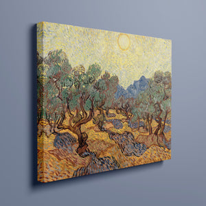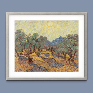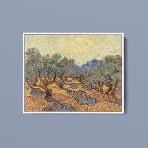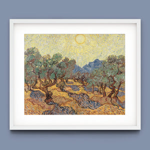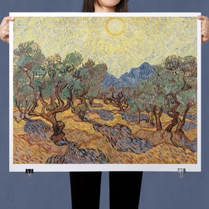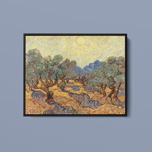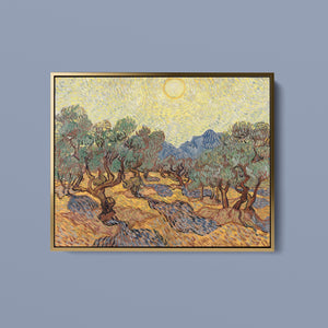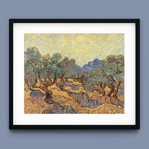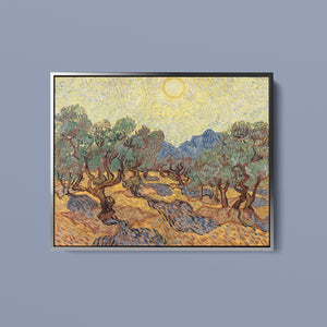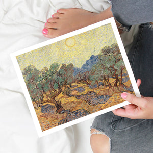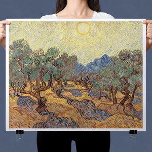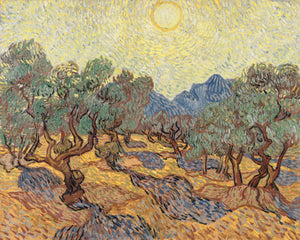 "Olive Orchard with Mountains and Disk of the Sun," painted by Vincent Van Gogh in 1889, is a vivid representation of the landscape surrounding Arles. The painting showcases an olive grove under a striking, intense sun with mountains in the background. Van Gogh’s characteristic bold, swirling brushstrokes and vibrant color palette bring the scene to life, reflecting his deep connection with the natural world. The rich, textured depiction of the olive trees contrasts with the dramatic, swirling sky, emphasizing the dynamic interplay between nature and the cosmos. The sun, rendered as a bright disk, adds a sense of energy and movement to the composition, embodying Van Gogh’s unique approach to capturing the essence of his environment. This painting is a testament to Van Gogh’s innovative use of color and form, revealing his emotional and artistic responses to the landscape around him.