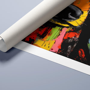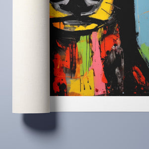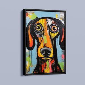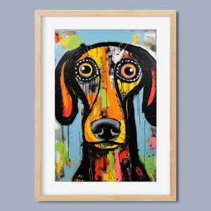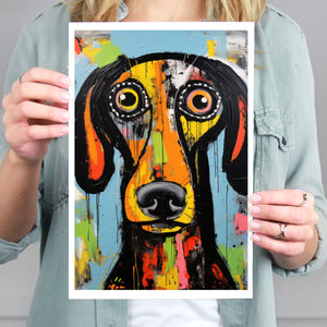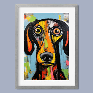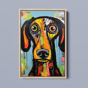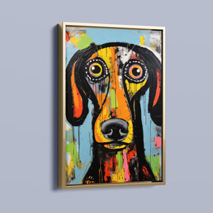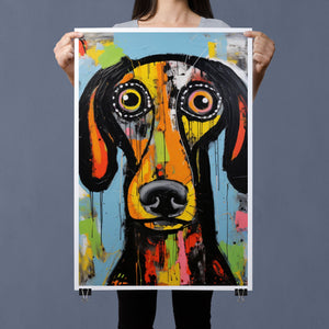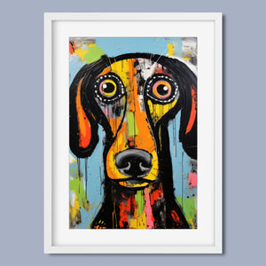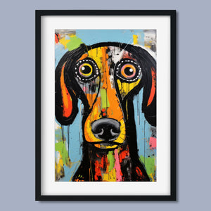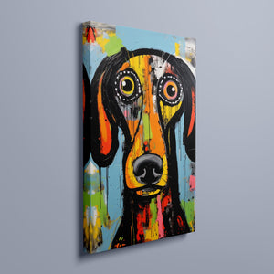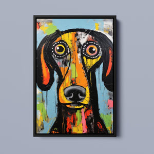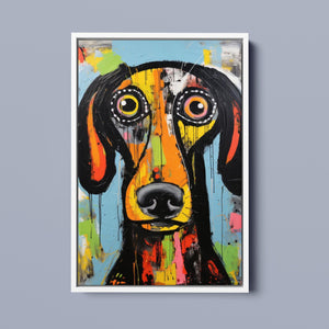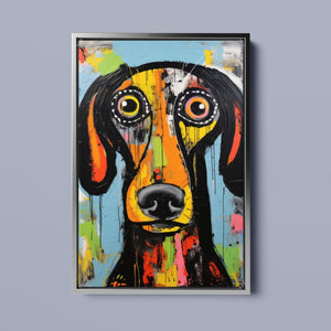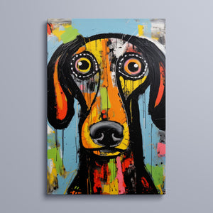 "On Edge" is a vivid and contemporary abstract painting that explores the emotional depth of a canine portrait. The artwork features a dynamic mix of black, blue, orange, and multicolor, capturing the intense and thoughtful gaze of the dog. With its expressive splatters and drips, "On Edge" combines street art flair with a whimsical, modern touch, creating a striking and emotive visual experience.