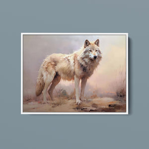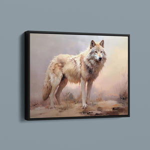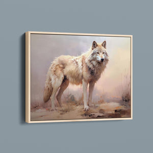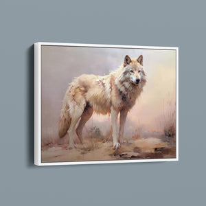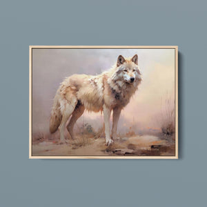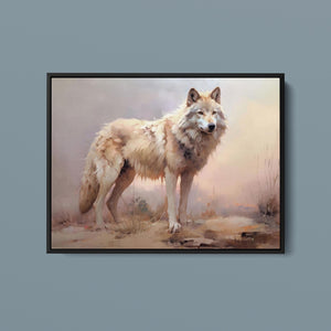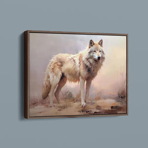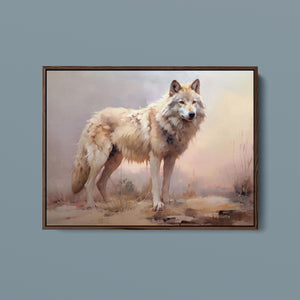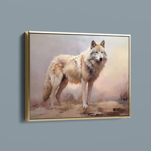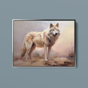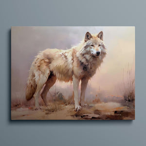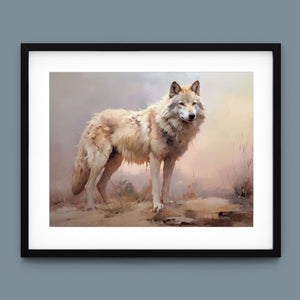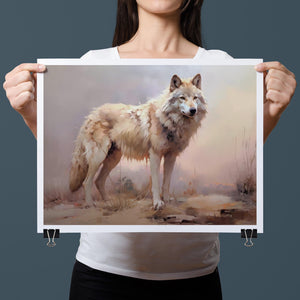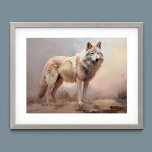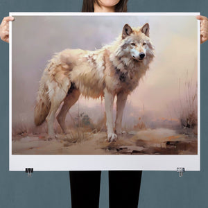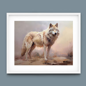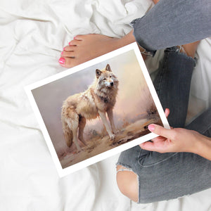 "On the Lookout" features a wolf in a contemporary watercolor style, perched in the Rocky Mountains. The painting uses subtle pastel colors to emphasize the wolf’s alertness amidst natural elements like lakes, streams, and trees, embodying the spirit of the wild.