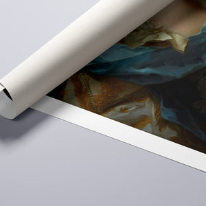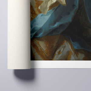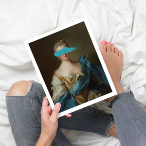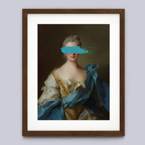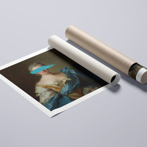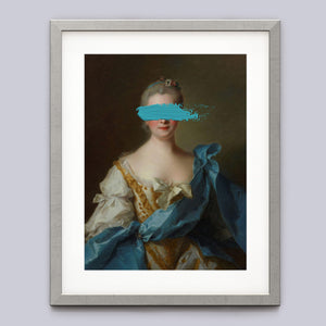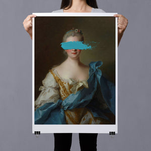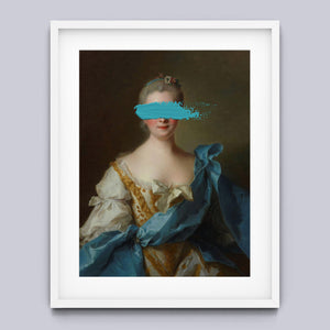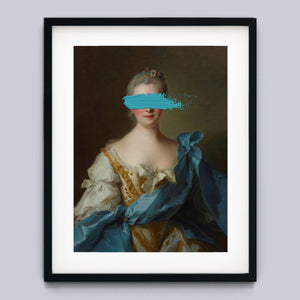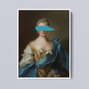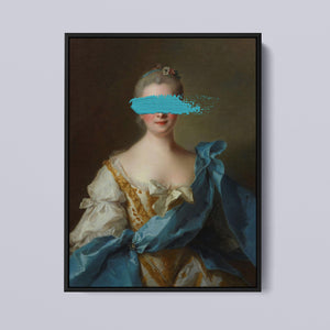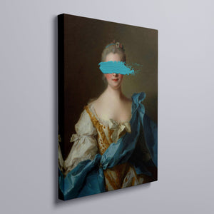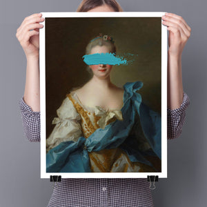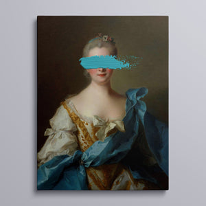 Paint Stroke Over Madame de La Porte is a striking altered portrait that reimagines classic European art with a contemporary twist. The 3x4 canvas portrays an elegant woman in a vintage setting, her dark hair and pensive gaze enhanced by rich blue, gold, and beige tones. The addition of bold, artistic brushstrokes introduces a modern pop culture element, contrasting with the ornate, aristocratic interior. This piece combines the mystery and elegance of classic portraiture with the expressive power of contemporary art, making it a captivating addition to any space.