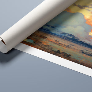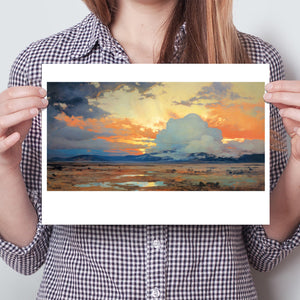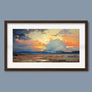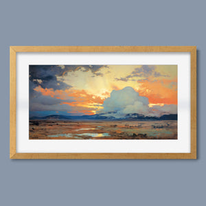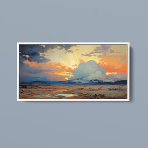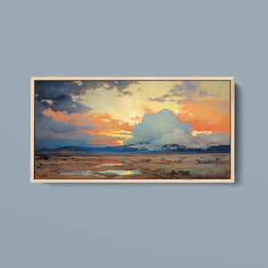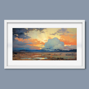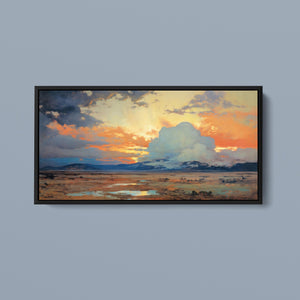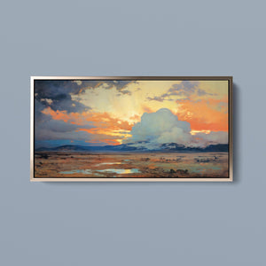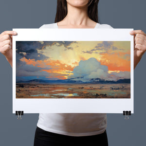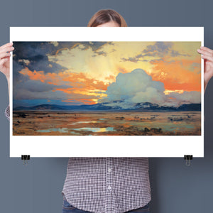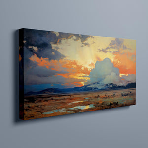 "Painted Western Plains" is a stunning abstract landscape that captures the essence of a vibrant sunset over the expansive prairie. This artwork features a breathtaking palette of oranges, yellows, and blues, reflecting the serene twilight sky. The dynamic brushstrokes depict fluffy clouds illuminated by the setting sun, while tranquil waters mirror the natural beauty of the wilderness. This piece invites viewers to immerse themselves in the peaceful atmosphere of the open sky and mountains, making it an ideal addition to any art collection that celebrates nature's splendor.