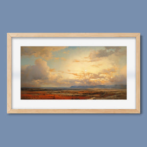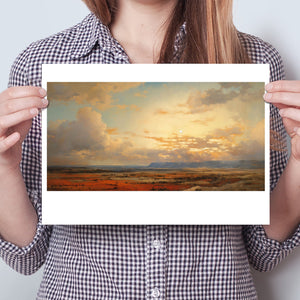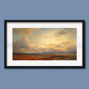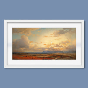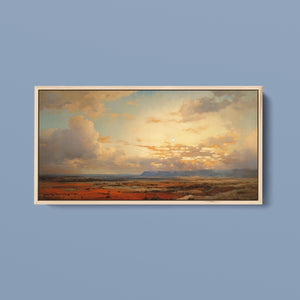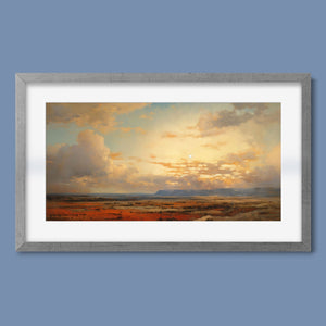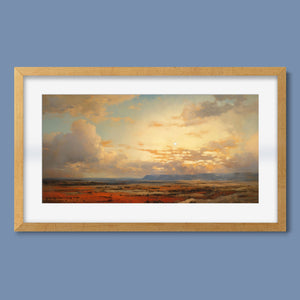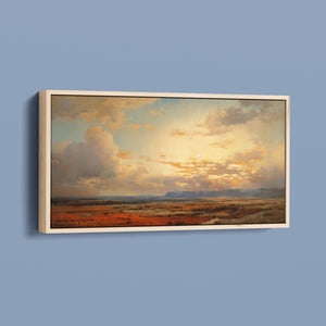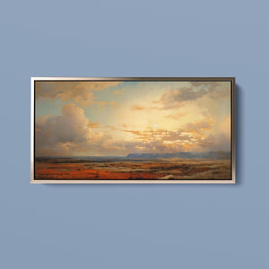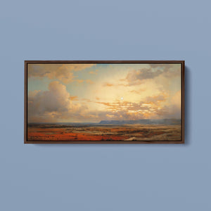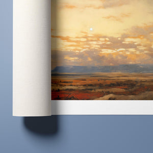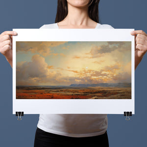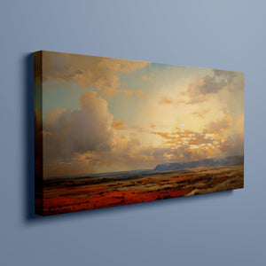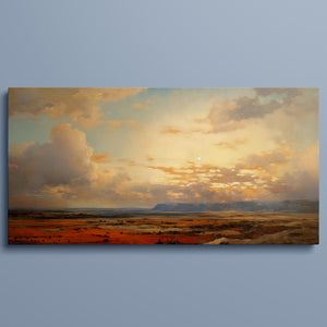 "Painted Western Plains" is a stunning abstract landscape that captures the essence of a vibrant sunset over the expansive prairie. This artwork features a breathtaking palette of oranges, yellows, and blues, reflecting the serene twilight sky. The dynamic brushstrokes depict fluffy clouds illuminated by the setting sun, while tranquil waters mirror the natural beauty of the wilderness. This piece invites viewers to immerse themselves in the peaceful atmosphere of the open sky and mountains, making it an ideal addition to any art collection that celebrates nature's splendor.