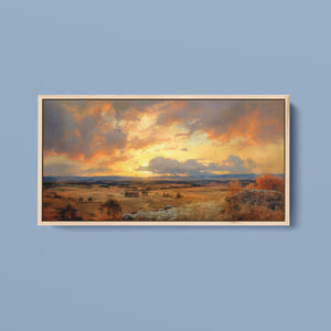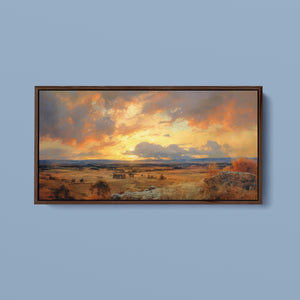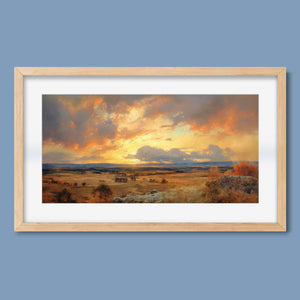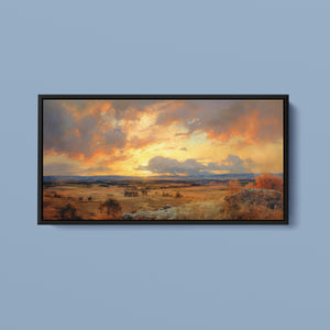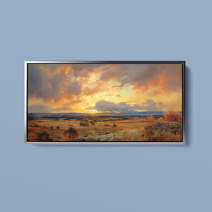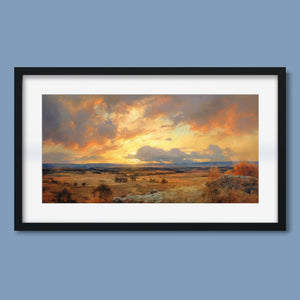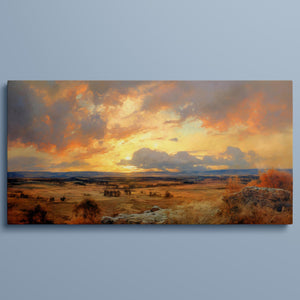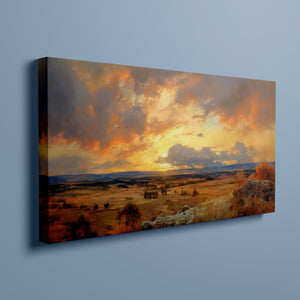 landscape painting of a vibrant sunset over the western plains, showcasing orange and yellow hues in the sky, with reflections on tranquil water, creating a serene and expansive atmosphere.