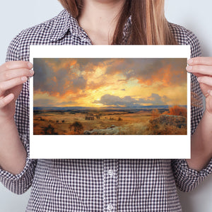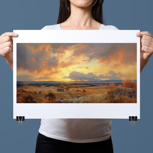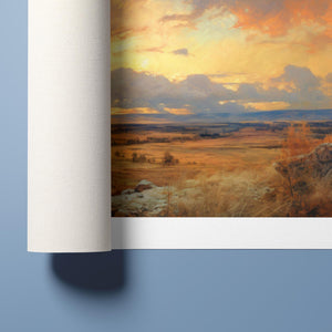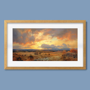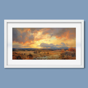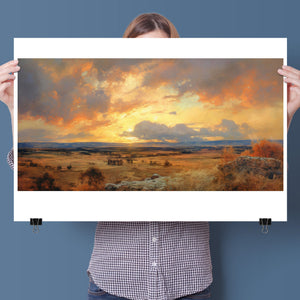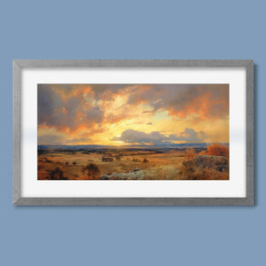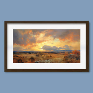 "Painted Western Plains" is a stunning abstract landscape that captures the essence of a vibrant sunset over the expansive prairie. This artwork features a breathtaking palette of oranges, yellows, and blues, reflecting the serene twilight sky. The dynamic brushstrokes depict fluffy clouds illuminated by the setting sun, while tranquil waters mirror the natural beauty of the wilderness. This piece invites viewers to immerse themselves in the peaceful atmosphere of the open sky and mountains, making it an ideal addition to any art collection that celebrates nature's splendor.
