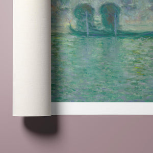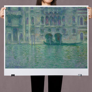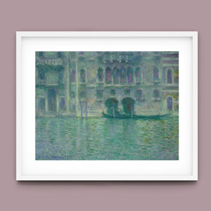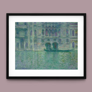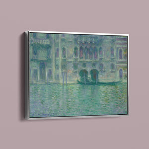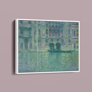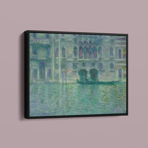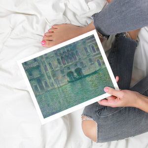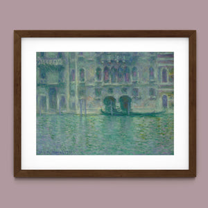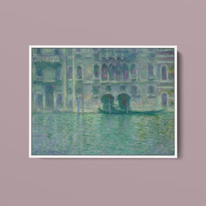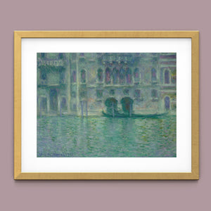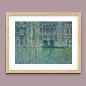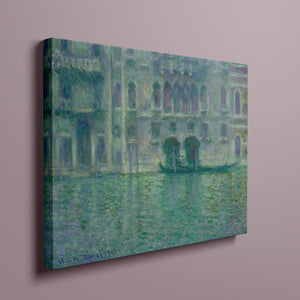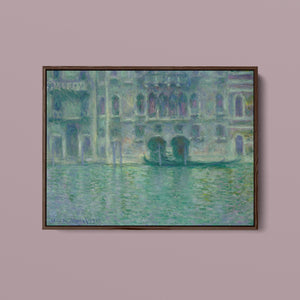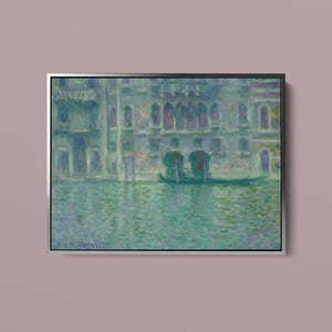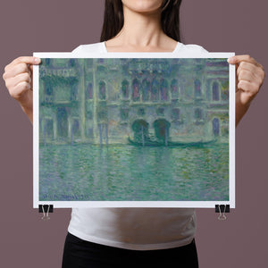 Vintage Impressionist painting "Palazzo da Mula Venice" by Claude Monet, showcasing the historic architecture of Venice with serene water reflections, gondolas, and pastel colors.