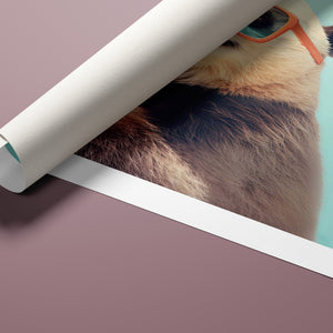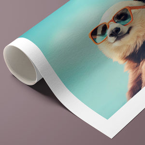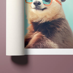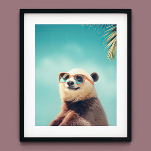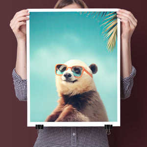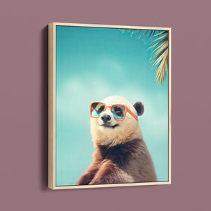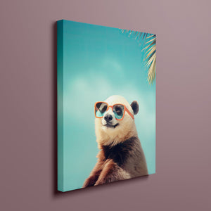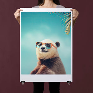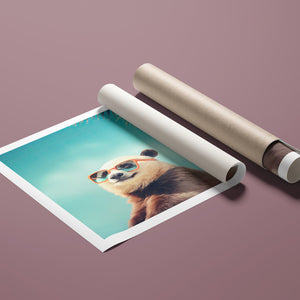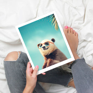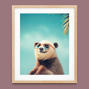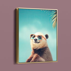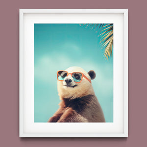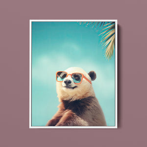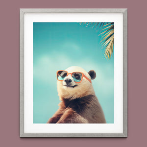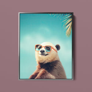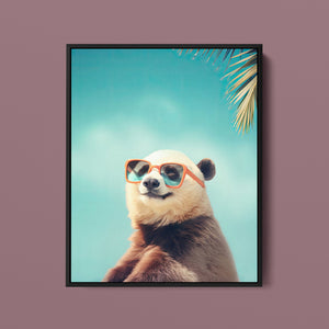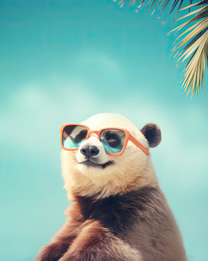 "Panda Paradise" is a charming 4x5 vertical artwork that beautifully portrays a panda enjoying a leisurely day in a tropical paradise. The panda, wearing stylish sunglasses, lounges under the bright blue sky, surrounded by lush greenery and vibrant, sunny elements. The piece exudes a sense of relaxation and cheerful enjoyment, making it a perfect depiction of nature's tranquility and whimsy. Ideal for adding a touch of playful elegance and vacation vibes to any space, this artwork captures the essence of leisure and the joy of wildlife in a bright and cheerful setting.