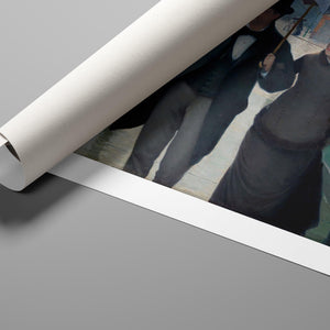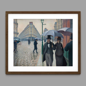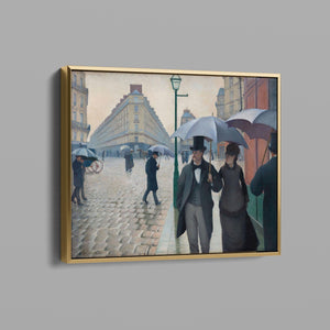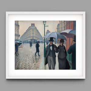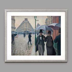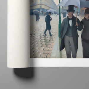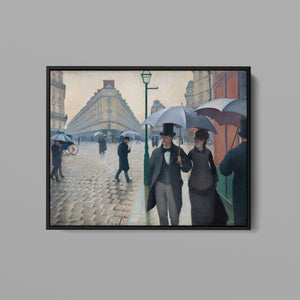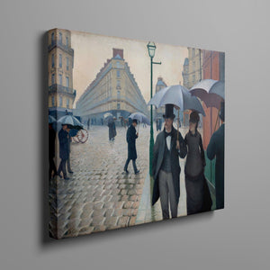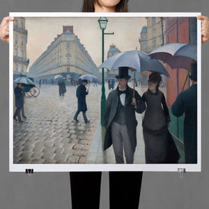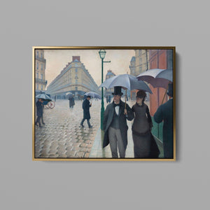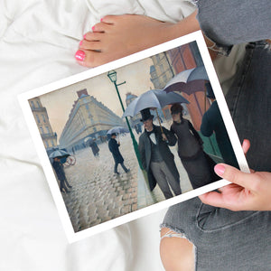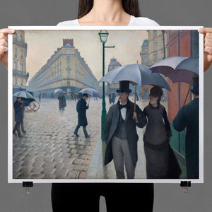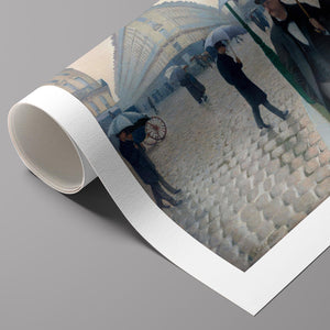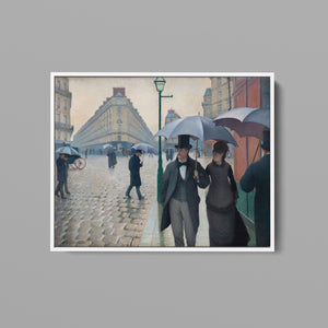 "Paris Street - Rainy Day" by Gustave Caillebotte is a celebrated Impressionist painting created in 1877 that offers a detailed and atmospheric portrayal of Parisian street life. The painting depicts a busy Paris street under the rain, featuring elegantly dressed figures navigating the wet pavement with umbrellas. Caillebotte’s use of perspective, with its precise depiction of the street and buildings, combined with the reflective quality of the wet pavement, provides a striking sense of realism. The composition captures the everyday life of Paris with a blend of modernity and naturalism, showcasing Caillebotte’s skill in portraying both the grandeur and the subtleties of urban environments. This artwork remains a significant example of Impressionism's ability to blend artistic innovation with the depiction of contemporary life.