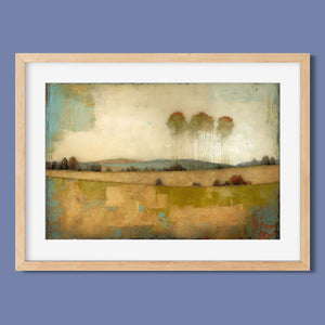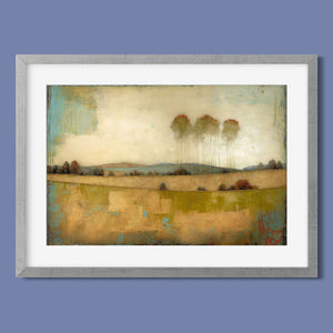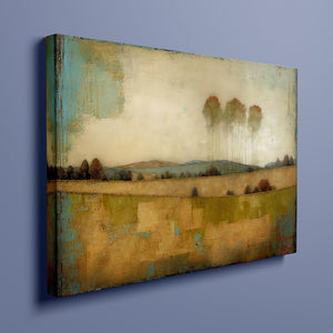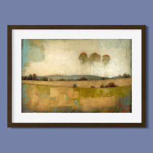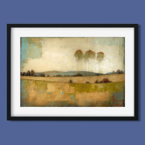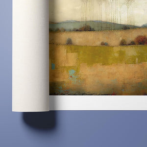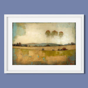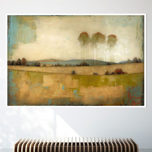 Abstract painting of a serene landscape featuring rolling hills and patchwork fields in warm tones of orange, beige, blue, and yellow, capturing the tranquil beauty of rural life.