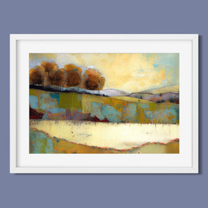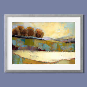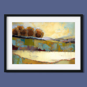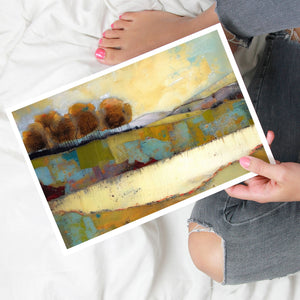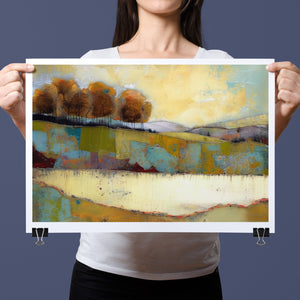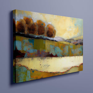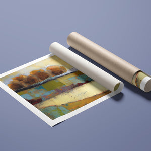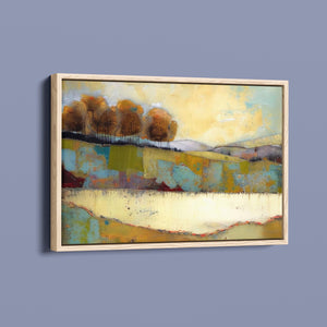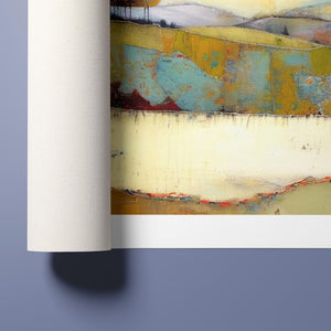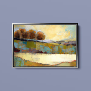 "Patchwork Summer Meadow II" is an impressionistic artwork that celebrates the vibrant colors of a summer meadow. With its lively palette of yellow, blue, and green, this abstract painting captures the essence of harmony and tranquility found in nature. The rolling hills and colorful fields evoke a sense of peace, making it a beautiful piece for those looking to infuse their space with the joy of the countryside.
