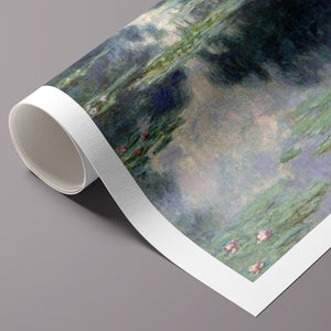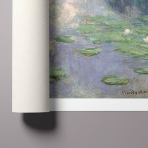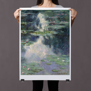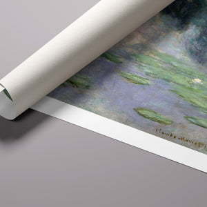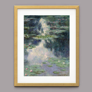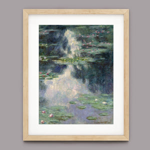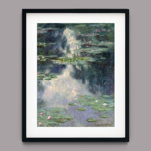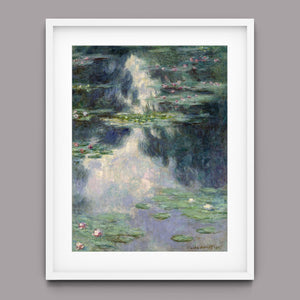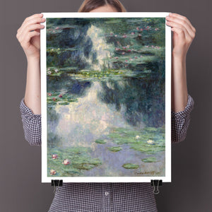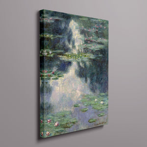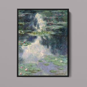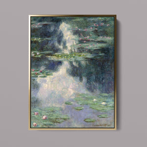 Vintage Impressionist painting "Pond with Water Lilies" by Claude Monet, showcasing serene lily pads, lush vegetation, and reflections with a tranquil, pastel-colored waterscape.