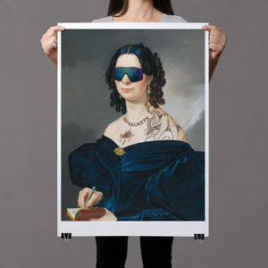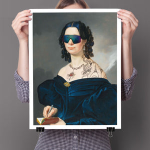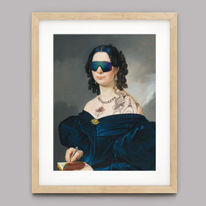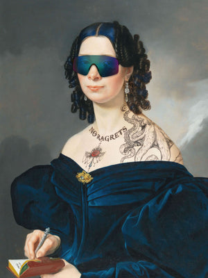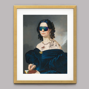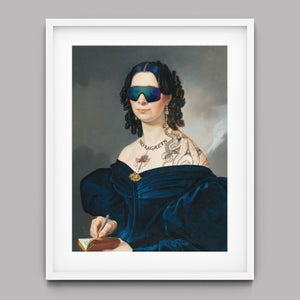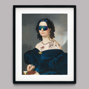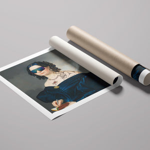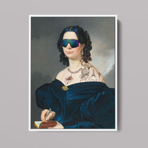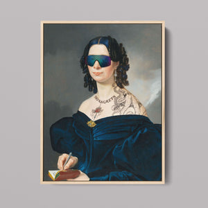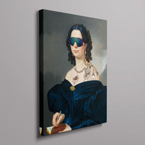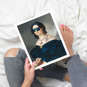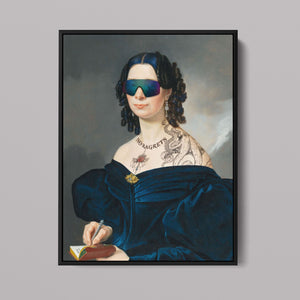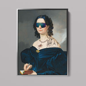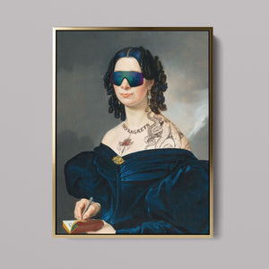 Portrait of a Lady in a Blue Dress with Tats, Vipers, and Blue Hair is an eclectic altered portrait that blends vintage sophistication with modern humor. The 3x4 canvas showcases a refined woman in a navy blue dress, adorned with vibrant blue hair, intricate tattoos, and striking viper imagery. Set against a serene pastel background with floral motifs, this piece merges classic portraiture with a playful, contemporary twist. The impressionistic brushstrokes and warm hues create a dynamic yet tranquil atmosphere, making this artwork a unique and eye-catching addition to any collection that celebrates both artistic tradition and modern flair.