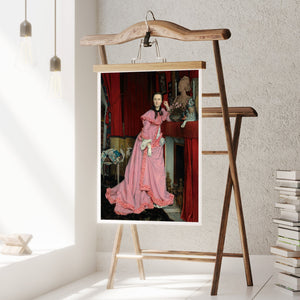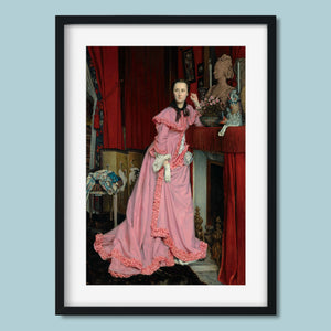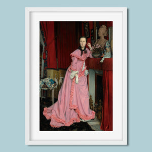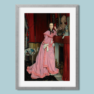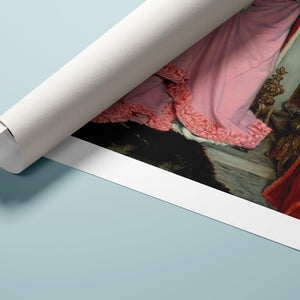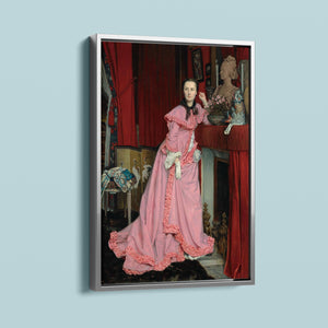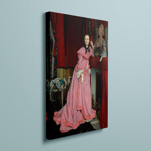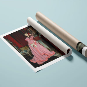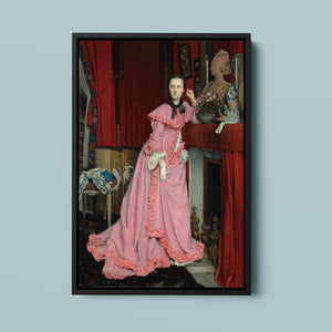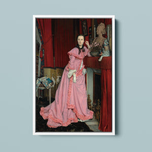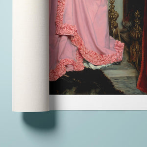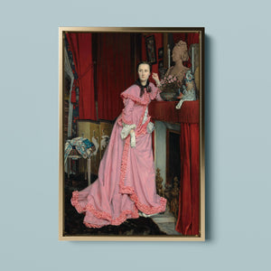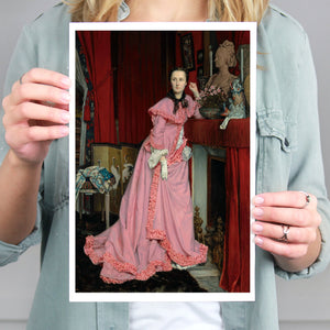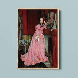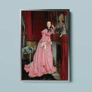 This elegant 19th-century portrait by James Tissot captures the refined beauty of the Marquise de Miramon, née Thérèse Feuillant. The vertical composition showcases her poised demeanor and sophisticated fashion, dressed in a delicate pink dress adorned with lace and ruffles. Set against a backdrop of red curtains and a floral arrangement, the painting reflects the opulence and serenity of Victorian aristocracy. The rich details in her attire and the luxurious interior decor emphasize her wealth and the classic elegance of the period.