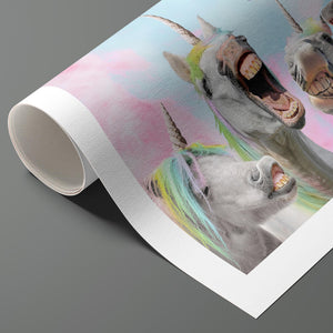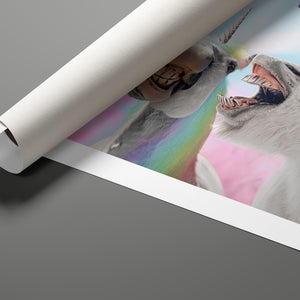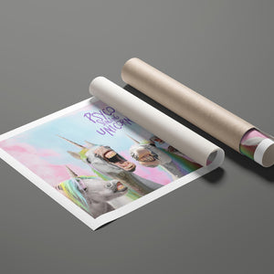 "Psyco Singing Unicorns" is a lively 5x4 horizontal artwork that brings whimsical fantasy to life. The illustration features mythical unicorns with vibrant, multicolored manes, joyfully singing against a dreamy pastel sky. With surreal elements like playful clouds and a rainbow backdrop, the piece exudes a magical and humorous atmosphere. This dynamic artwork celebrates the imagination and playful spirit of fantasy, making it a unique addition to any collection that embraces joy and whimsy.