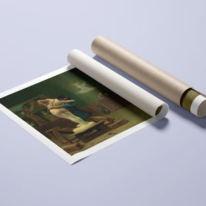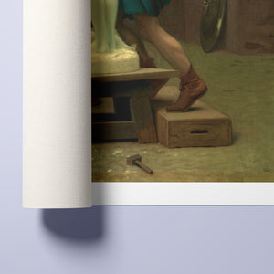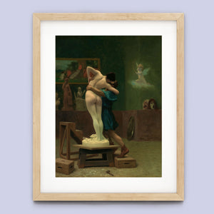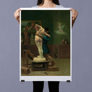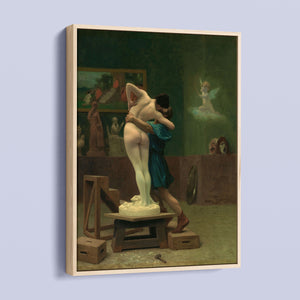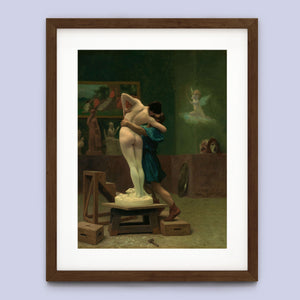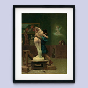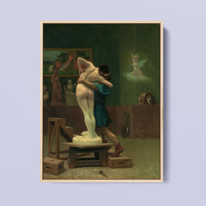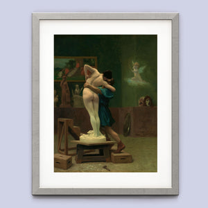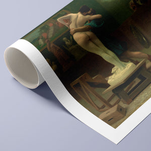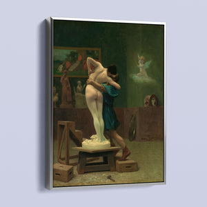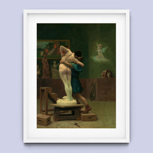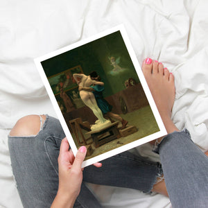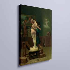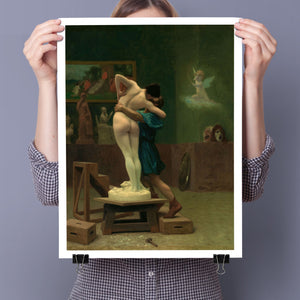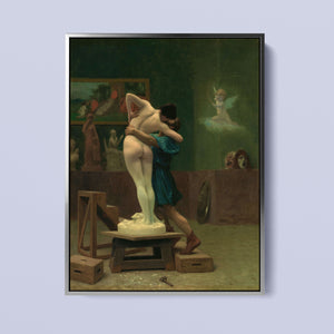 Immerse yourself in the mythological romance of Pygmalion and Galatea by Jean-Léon Gérôme. This classic 19th-century painting vividly portrays the moment of transformation and love between the sculptor and his animated creation. Set in a studio, the artwork captures the emotional embrace and allegorical significance of the myth, highlighting the intricate craftsmanship and romanticism of the era with rich brown and green tones.