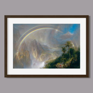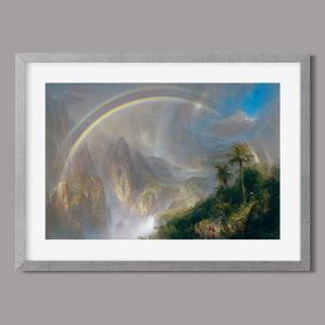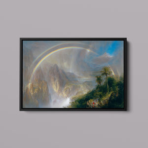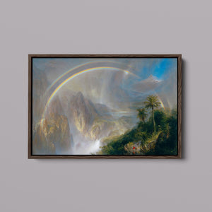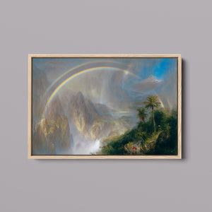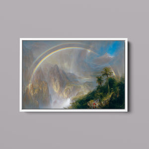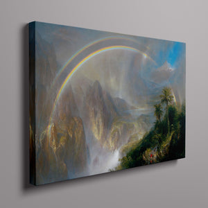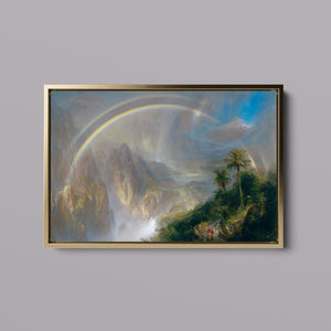 Panoramic painting by Frederic Edwin Church of a tropical landscape featuring misty mountains, a vibrant rainbow, and rich foliage, capturing the dramatic and serene beauty of the rainy season with atmospheric and ethereal tones.