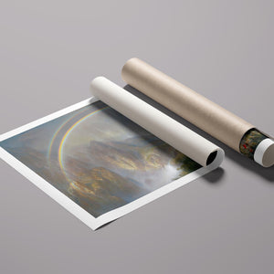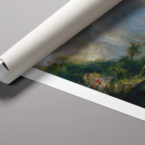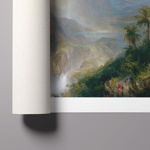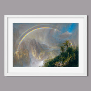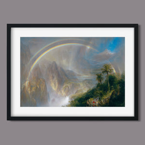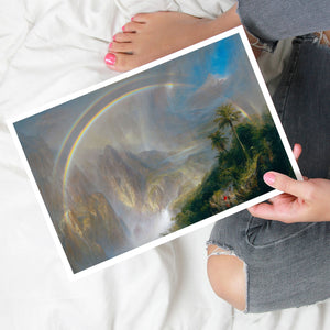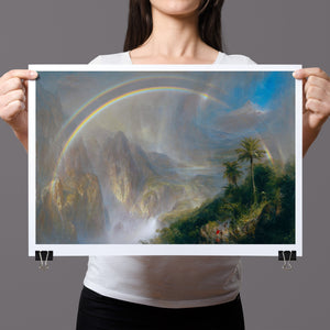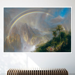 "Rainy Season in the Tropics" by Frederic Edwin Church captures the sublime beauty of tropical nature during a dramatic rainstorm. This horizontal painting presents a panoramic view of a lush tropical landscape with misty mountains, a vibrant rainbow, and rich foliage. The use of blue, green, and white tones enhances the atmospheric and ethereal quality of the scene. Church’s depiction of palm trees and a winding river reflects the adventure and exploration inherent in the tropics, showcasing the natural phenomena and serene beauty of the region.