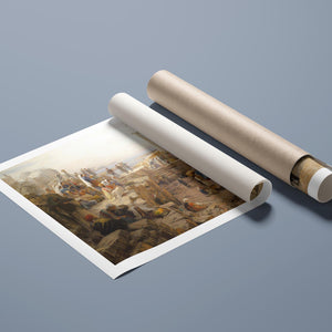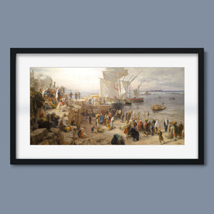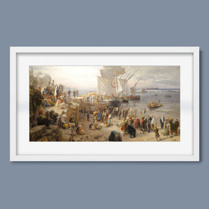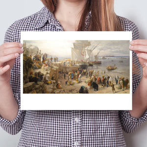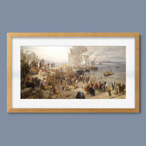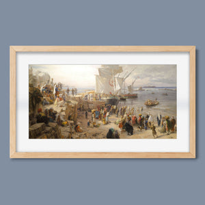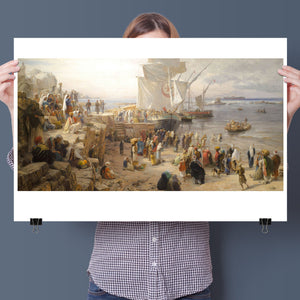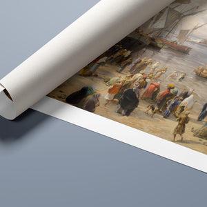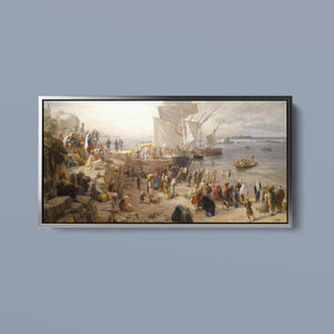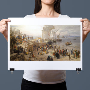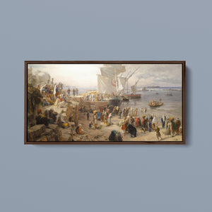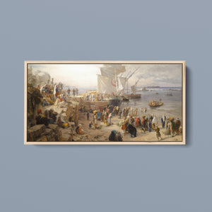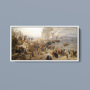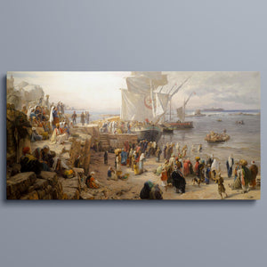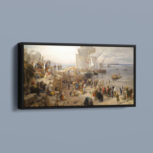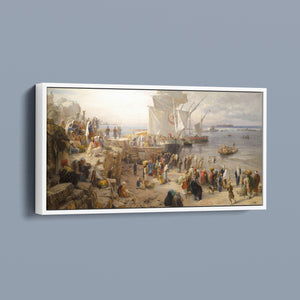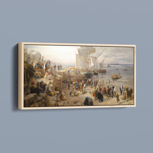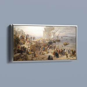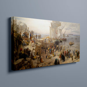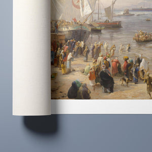 This historical painting captures a significant moment in the 19th century, depicting the enlistment of Turkish soldiers at Jaffa port. The scene is vibrant with crowds dressed in traditional Ottoman uniforms and cultural attire, gathered along the coastal docks. Sailboats dot the sea, symbolizing trade and shipping in the region. The artwork highlights the architectural elements of the era, combined with the essence of military customs and ceremonies, offering a glimpse into the rich history of the Middle East.