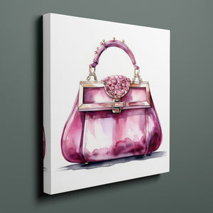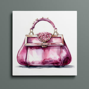 Watercolor illustration of a pink handbag with a metallic clasp, detailed brushwork, and vibrant textures, blending elegance and style in a chic and artistic design.