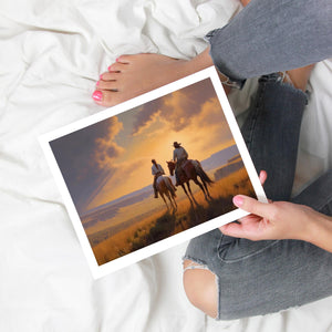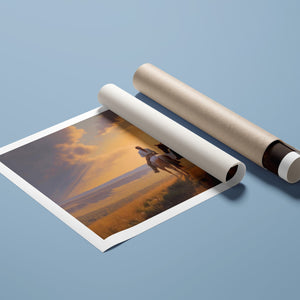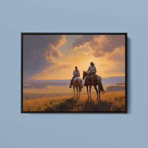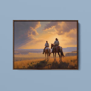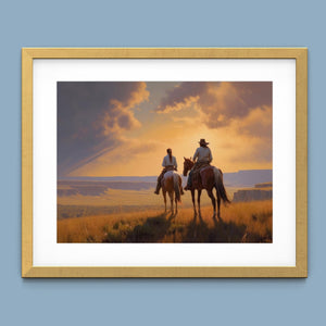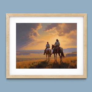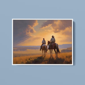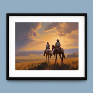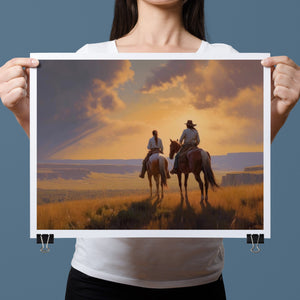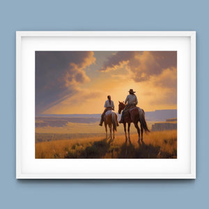 "Riders of the Dying Day" depicts a romantic cowboy couple on horseback, journeying into a vivid sunset. This artwork highlights the beauty of the Western landscape, with expansive plains and a dramatic sky, embodying the timeless romance of the American West.