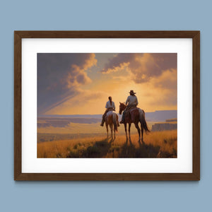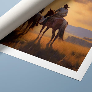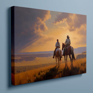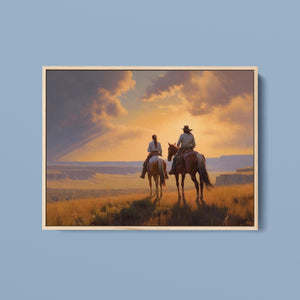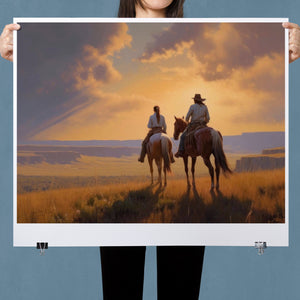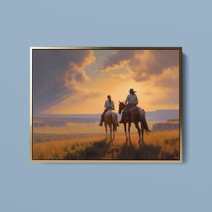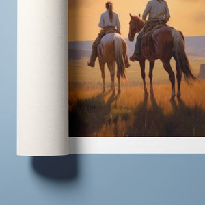 Riders of the Dying Day - Cowboy Couple on Horseback Riding into the Sunset