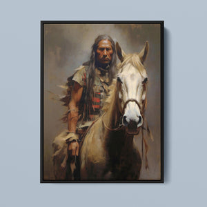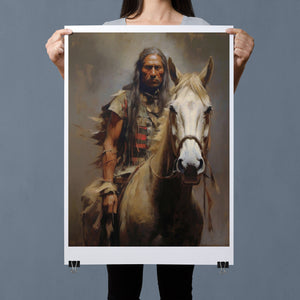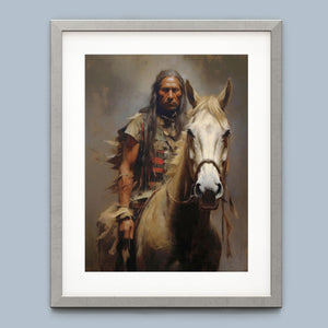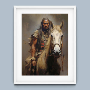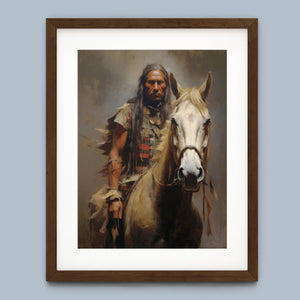 Portrait of an American Indian brave on horseback, wearing traditional attire and a feathered headdress, symbolizing Native American warrior culture and heritage.