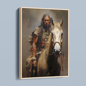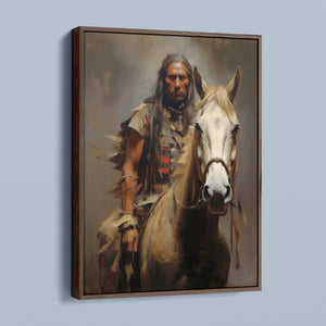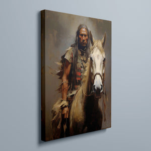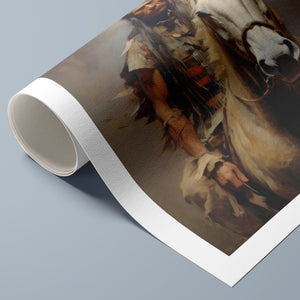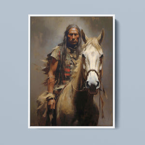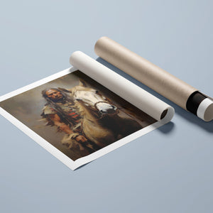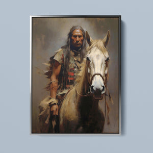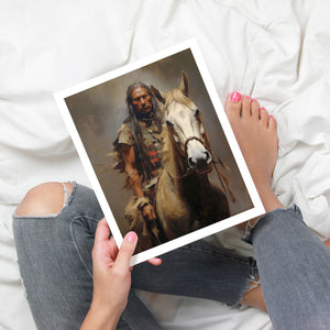 "Riding with the Wind" captures a classic portrait of an American Indian brave riding a horse, showcasing traditional attire and a feathered headdress. This painting honors the bravery and cultural heritage of Native American warriors, reflecting their historical and tribal pride.