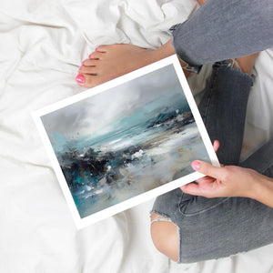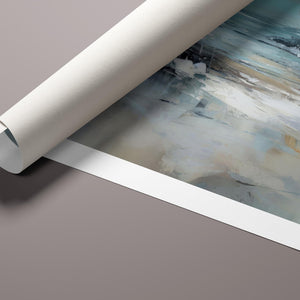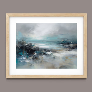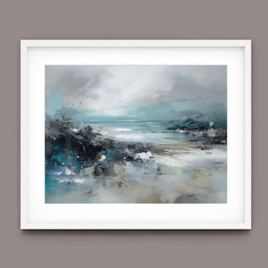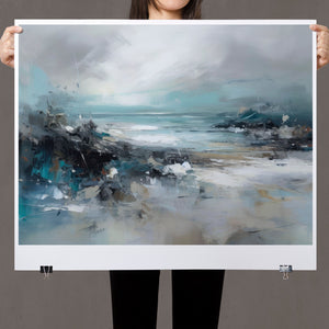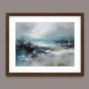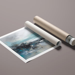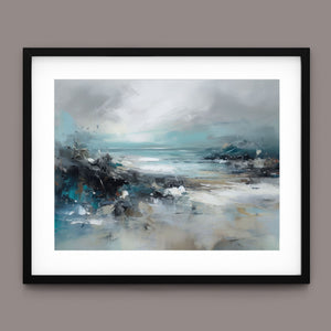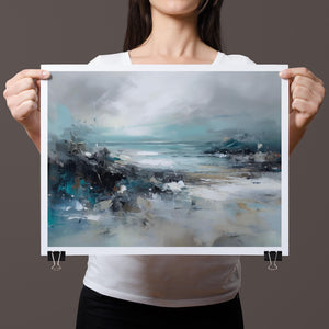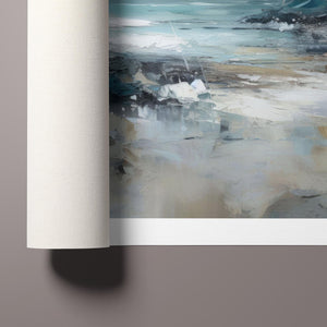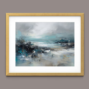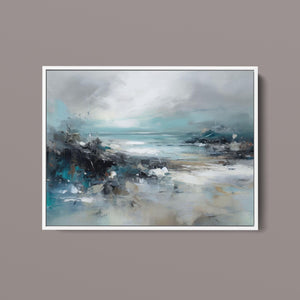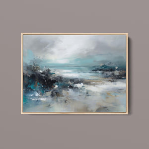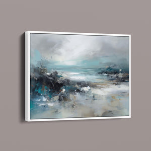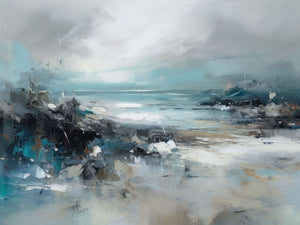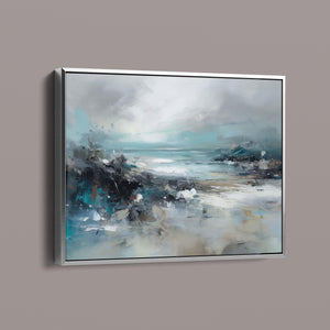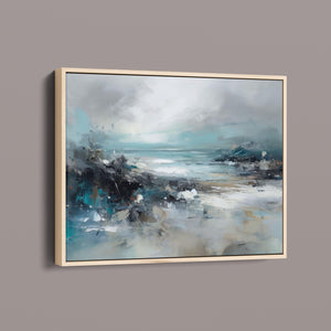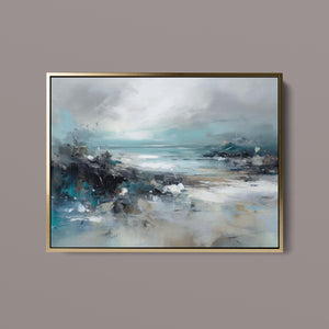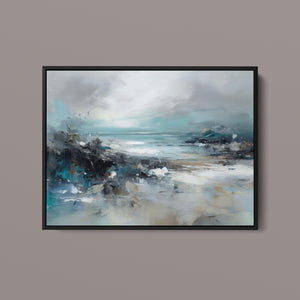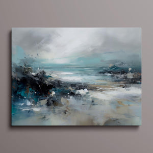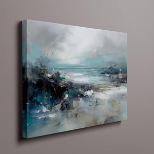 Rocky Shoreline is a captivating abstract seascape that portrays the serene yet powerful ambiance of a rugged coast. With a blend of muted blue, gray, and gold tones, this 4x3 canvas showcases the natural beauty of jagged rocks against a turbulent sea and overcast sky. The dynamic brushstrokes evoke the movement of waves and the subtle textures of foam, creating a tranquil coastal scene that brings the essence of nature into your space. Perfect for those seeking a contemporary and serene addition to their wall decor.