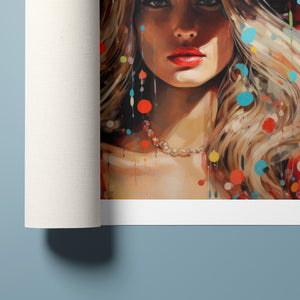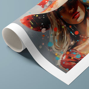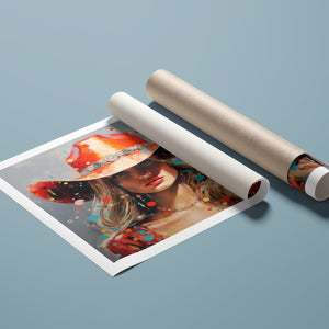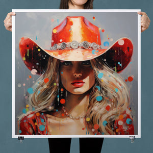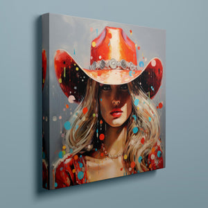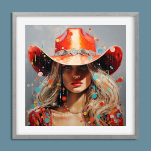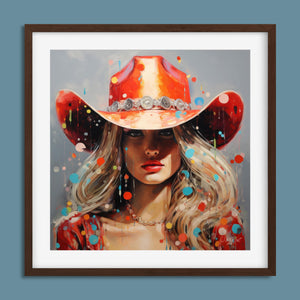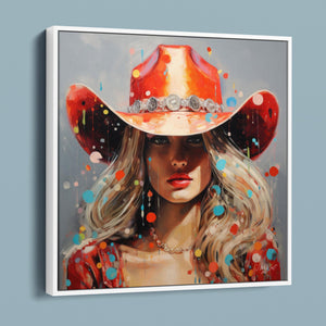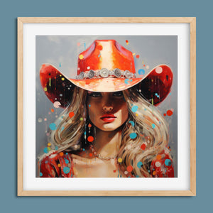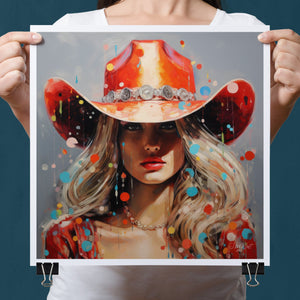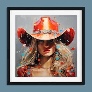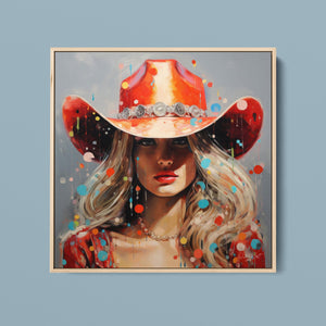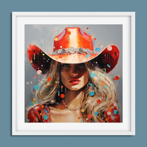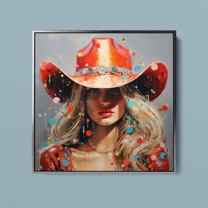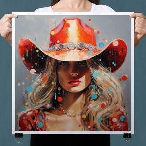 "Rodeo Queen" captures the allure of western elegance with a bold oil painting of a cowgirl adorned in a striking red hat. The artwork highlights the cowgirl's fashionable attire and rodeo queen presence, blending rustic western charm with a touch of high-fashion sophistication. With its dynamic brushwork, this portrait celebrates the beauty and confidence of a rodeo queen in a vibrant, modern style.
