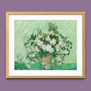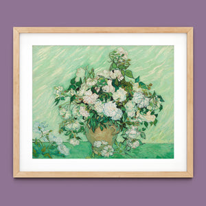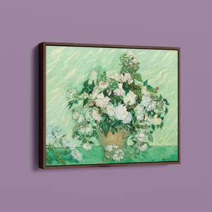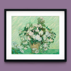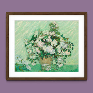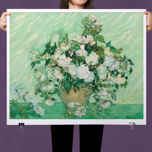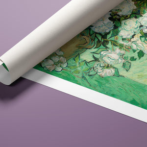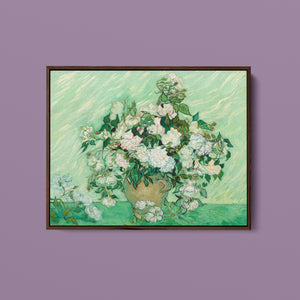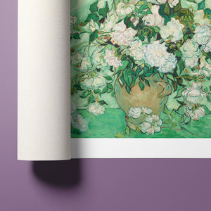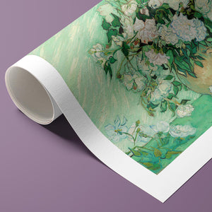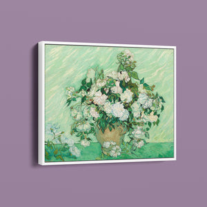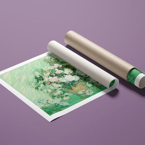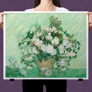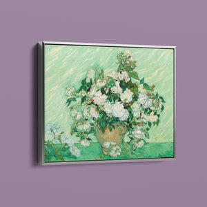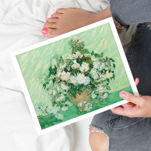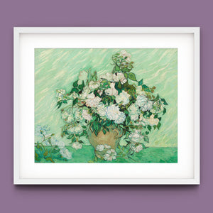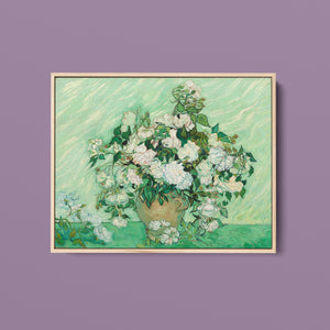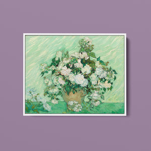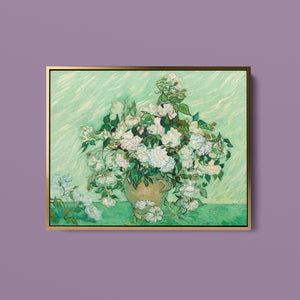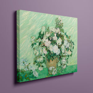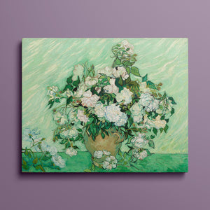 "Roses," painted by Vincent Van Gogh in 1890, showcases his mastery of color and form through a captivating depiction of roses. This Post-Impressionist work highlights Van Gogh's distinctive approach to painting, with its vibrant palette and dynamic brushstrokes that breathe life into the flowers. The painting features a lush arrangement of roses, rendered in shades of pink and white, against a contrasting background that accentuates their delicate beauty. Van Gogh’s use of thick, textured paint creates a sense of depth and movement, making the roses appear almost three-dimensional. "Roses" reflects Van Gogh's deep appreciation for nature and his ability to convey emotion through his innovative use of color and technique. The artwork not only captures the elegance of the roses but also embodies Van Gogh’s unique vision and artistic expression.